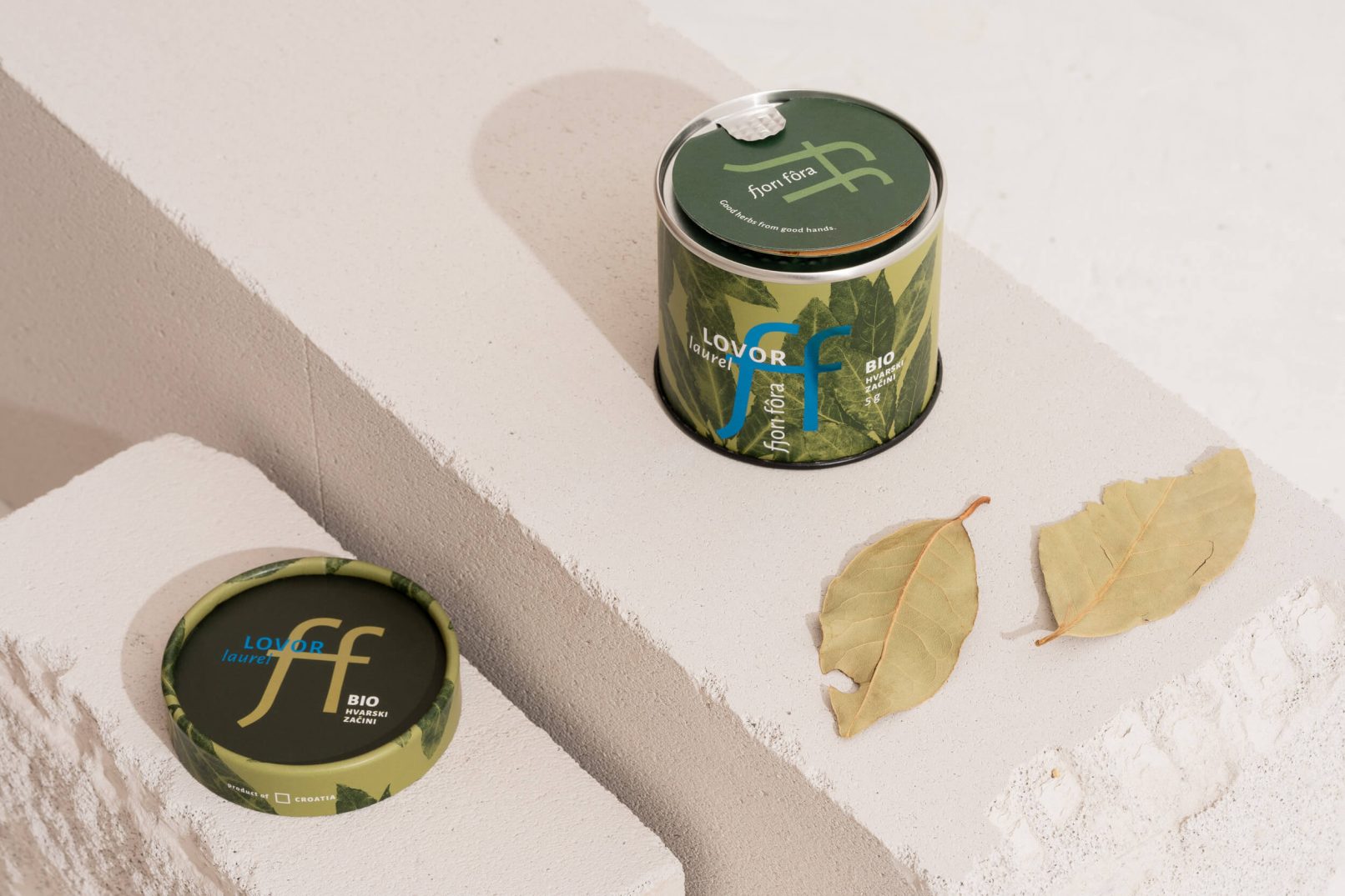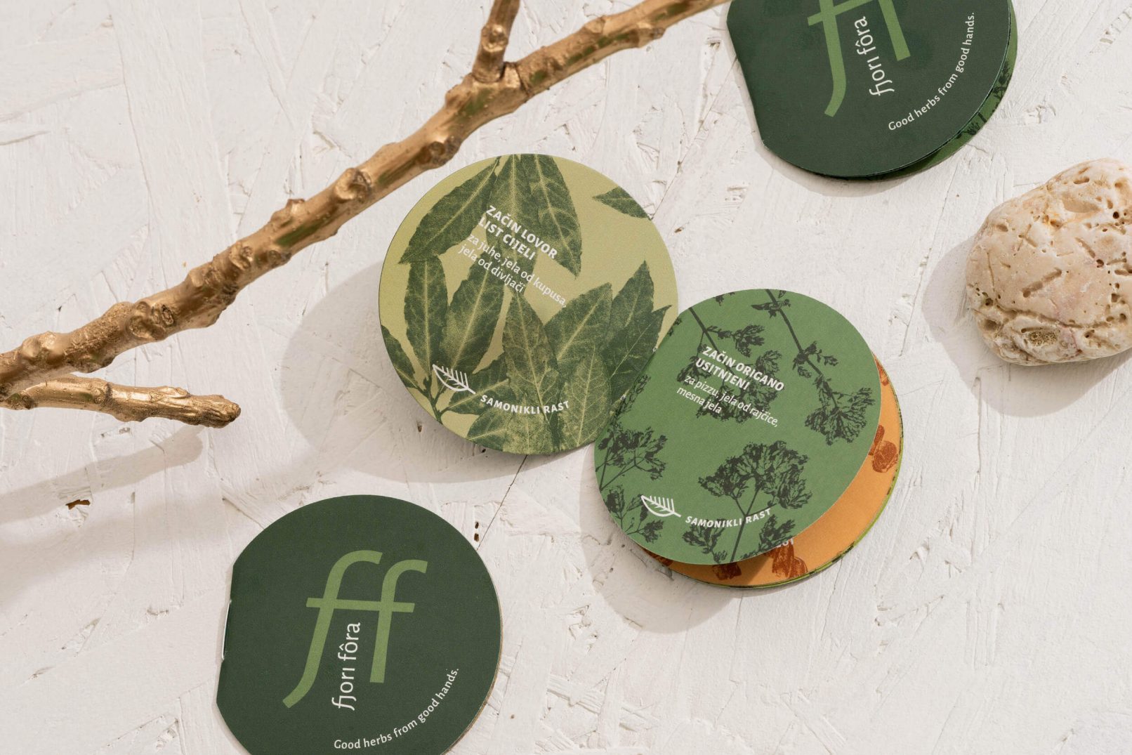 The packaging is a hard-laminated multilayer sleeve suitable for food packaging and machine filling. The inner part of each product’s packaging holds the protective closure and a Fjori fôra brand brochure that presents other products in the organic herbs line.
