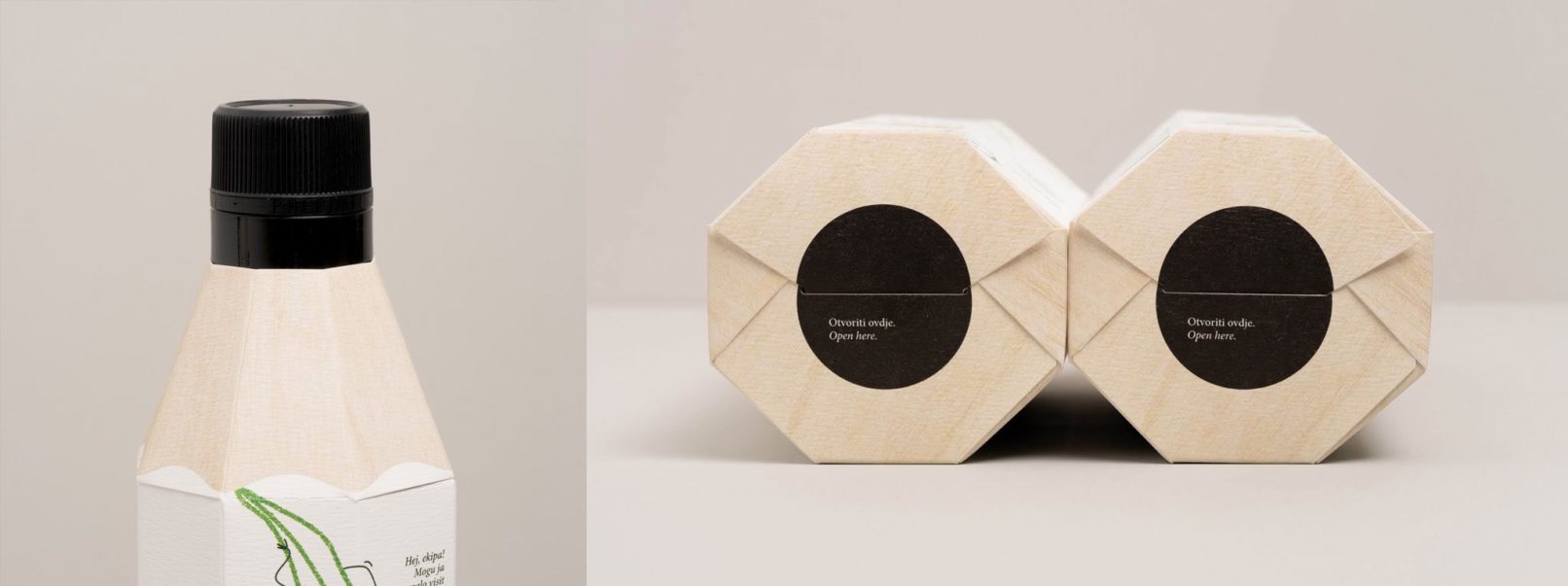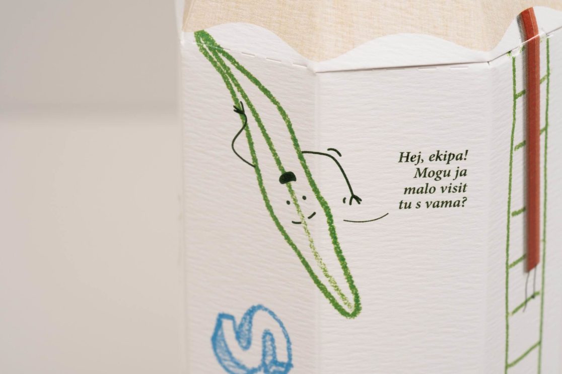 Tijelo staklene bočice djelomično je obučeno u kutiju koja zajedno sa crnim vrhom bočice tvori oblik bojice, a unutar koje je doista i smješteno 6 bojica. Prilikom rastvaranja kutije, otkriva se zabavna bojanka s ilustracijama drveta i listova maslina te raznih zadataka za djecu.