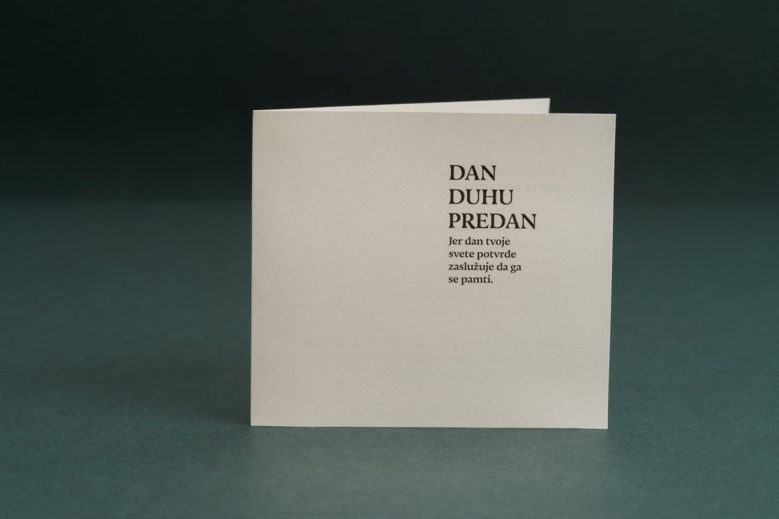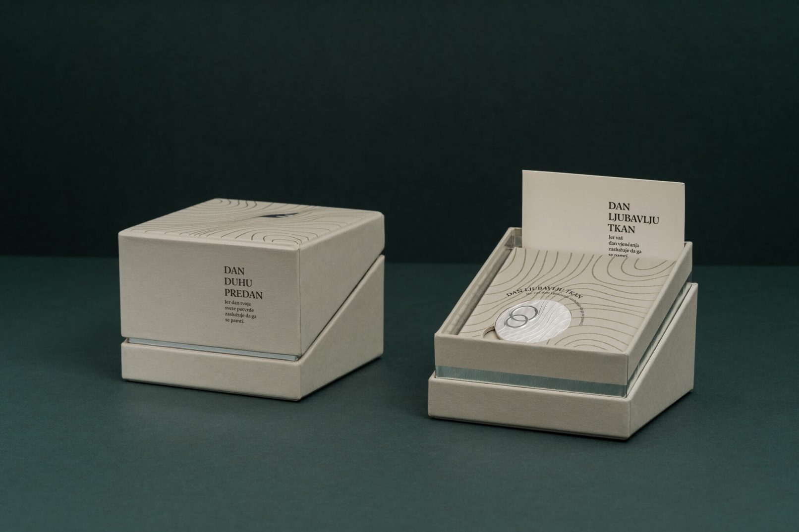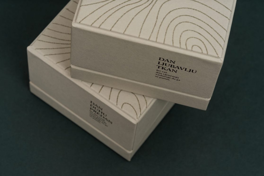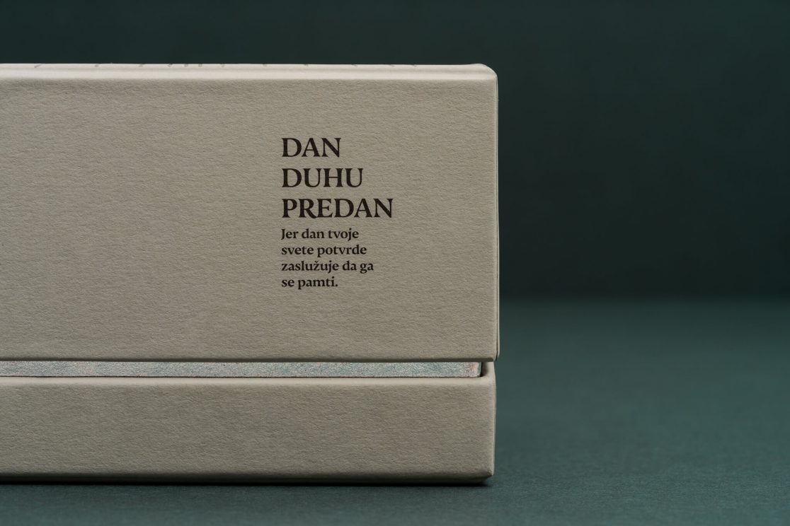 Poruke na proizvodima: “Dan duh predan. Jer dan tvoje svete potvrde zaslužuje da ga se pamti” i “Dan ljubavlju tkan. Jer dan tvog vjenčanja zaslužuje da ga se pamti.” ističu važnost trenutka koji se obilježava. Tako sama ambalaža postaje primarni prenositelj poruka važnog dana u životu, a ne samo “omotač” za prigodni poklon koji nosi.
