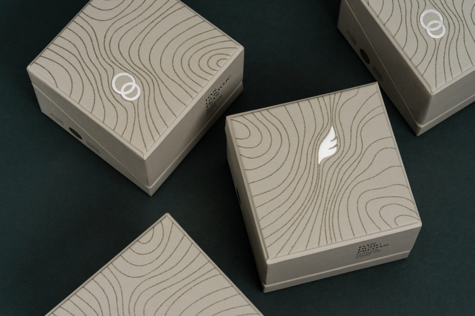 Na ambalaži se kombiniraju tehnike offseta tiska, termografije koja daje taktilni doživljaj i foliotiska kojim je označeno da li se u pakiranju nalazi medalja u srebrnoj ili zlatnoj varijanti. Dizajn se bazira na suptilno uravnoteženim odnosima materijala i tehnika, čime su sami proizvod i poruke stavljeni u prvi plan.