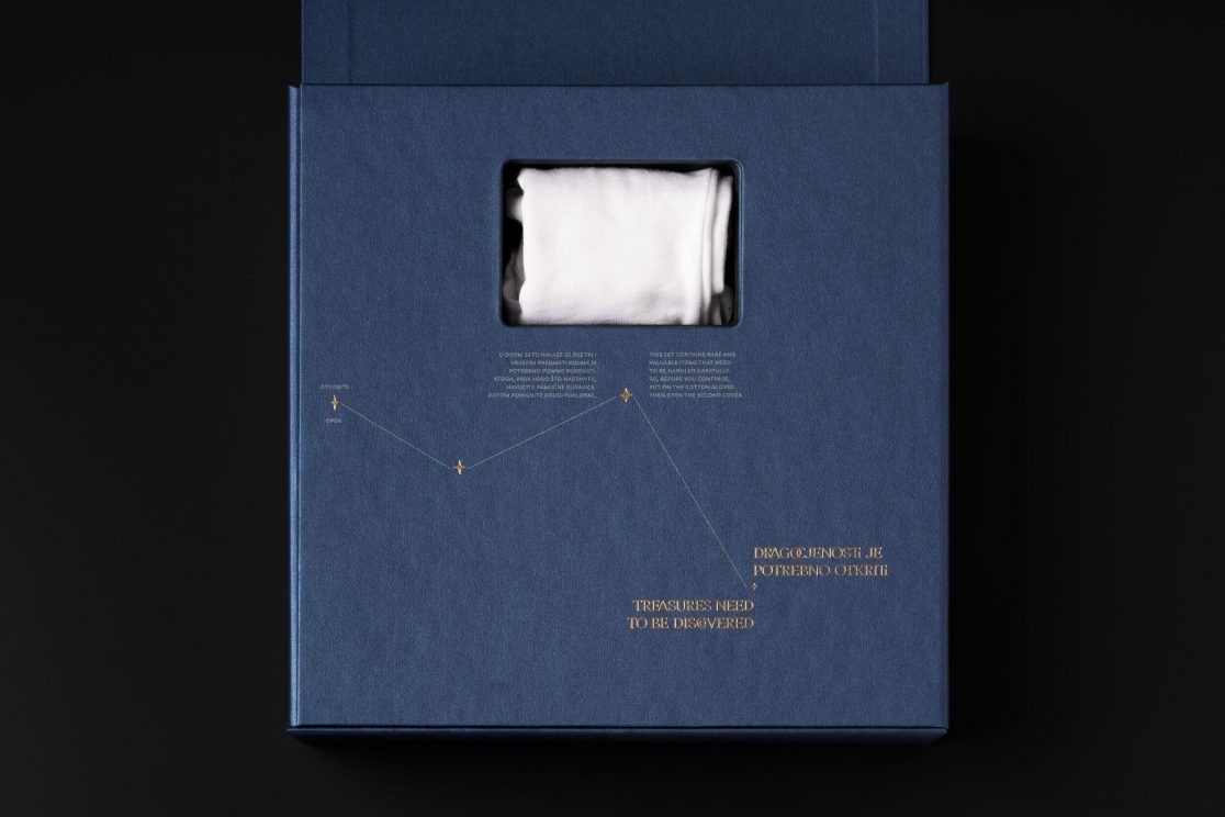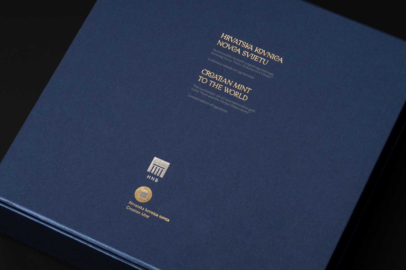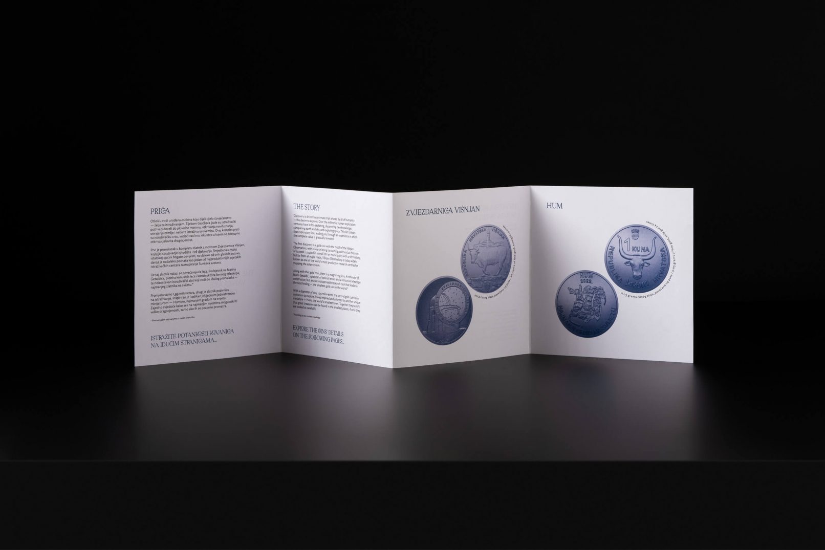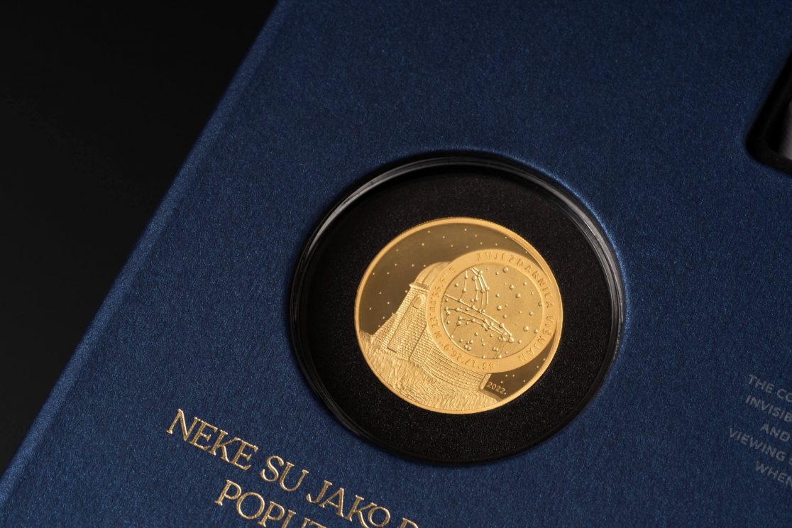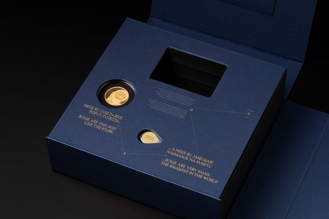Posebna je pažnja pridana ekskluzivnoj ambalaži u koju je ovaj posebni set smješten: tvrdo kaširana kutija, presvučena specijalnim tamno plavim papirom, rastvara se poput karte i vodi do dragocjenosti, pružajući iskustvo otkrivanja velike vrijednosti. Postupak otvaranja pravi je doživljaj, jer rastvaranjem iz manjeg u veće, svakim se korakom otkriva jedan dio seta kroz koji vodi ispisan zlatni tekst. Potpunim otvaranjem otkrivaju se zlatnici Hum i Zvjezdarnica Višnjan, na podlozi osvijetljenoj mnoštvom malih lampica poput zvjezdanog neba. Uz zlatnike se u kutiji nalaze i zaštitne pamučne rukavice te povećalo za promatranje najmanje kovanice.