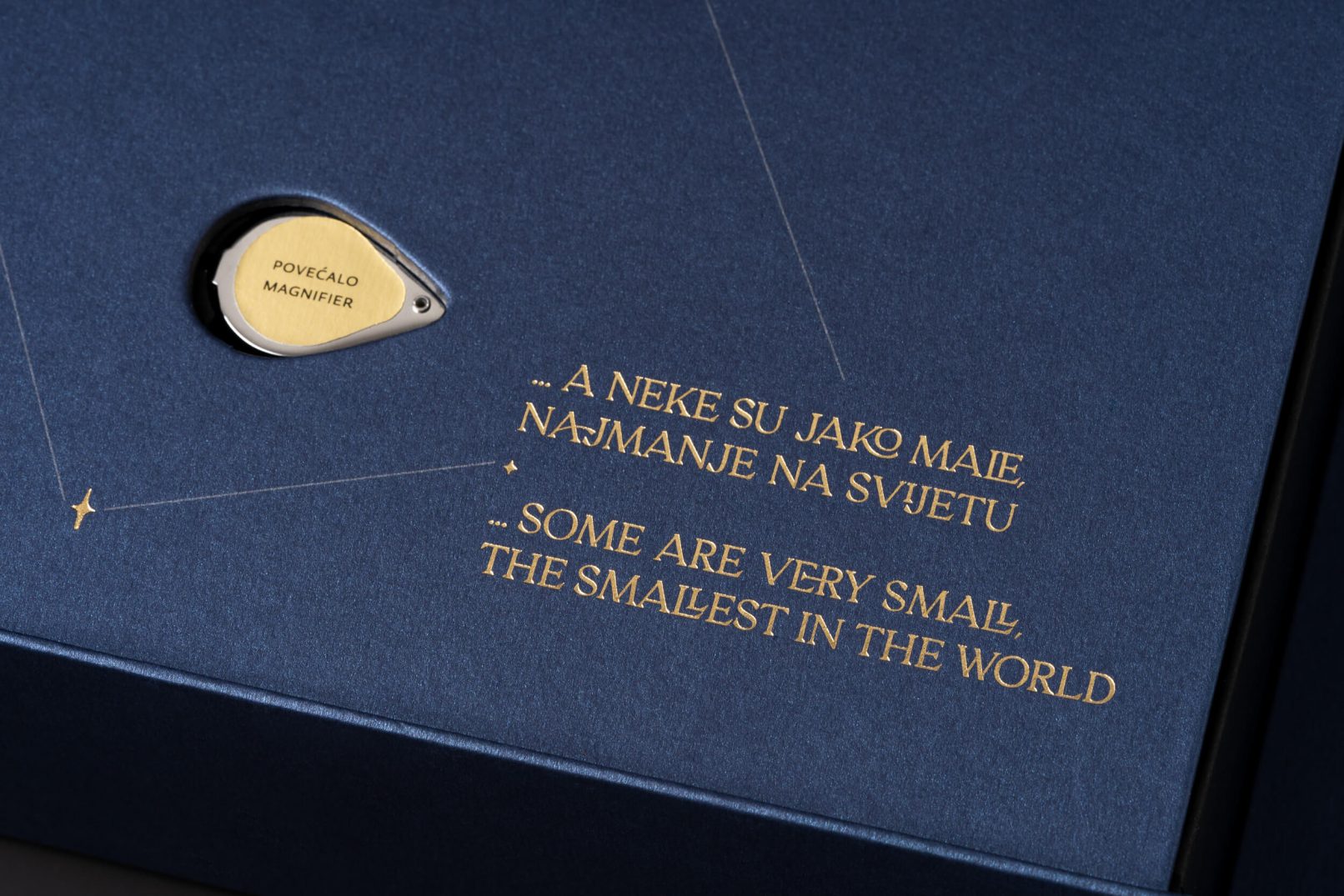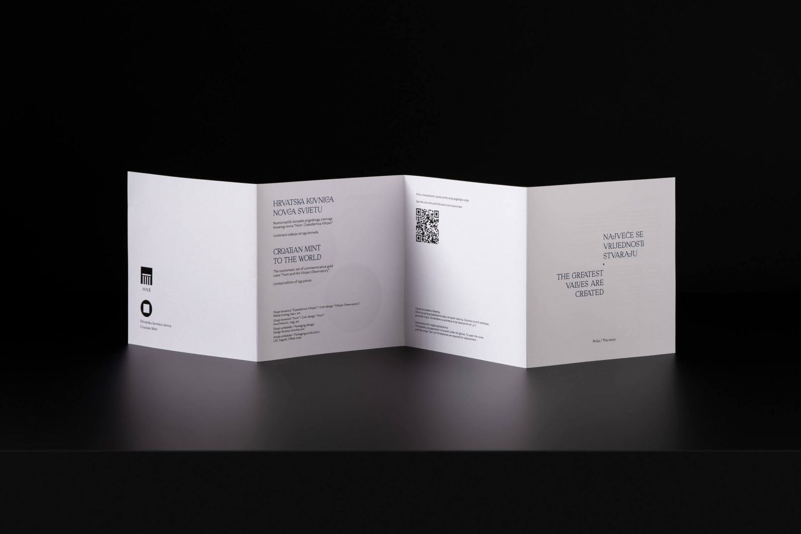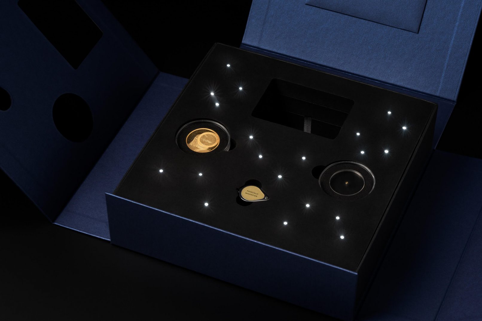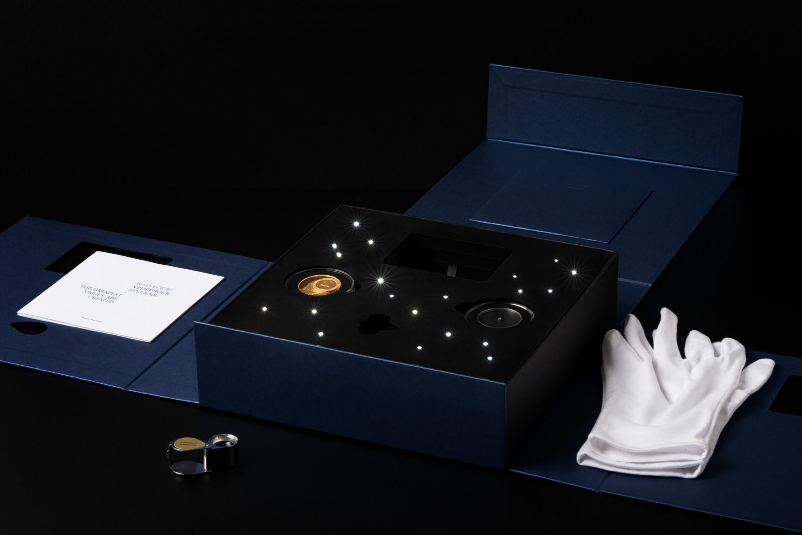 Posebna je pažnja pridana ekskluzivnoj ambalaži u koju je ovaj posebni set smješten: tvrdo kaširana kutija, presvučena specijalnim tamno plavim papirom, rastvara se poput karte i vodi do dragocjenosti, pružajući iskustvo otkrivanja velike vrijednosti. Postupak otvaranja pravi je doživljaj, jer rastvaranjem iz manjeg u veće, svakim se korakom otkriva jedan dio seta kroz koji vodi ispisan zlatni tekst. Potpunim otvaranjem otkrivaju se zlatnici Hum i Zvjezdarnica Višnjan, na podlozi osvijetljenoj mnoštvom malih lampica poput zvjezdanog neba. Uz zlatnike se u kutiji nalaze i zaštitne pamučne rukavice te povećalo za promatranje najmanje kovanice.
