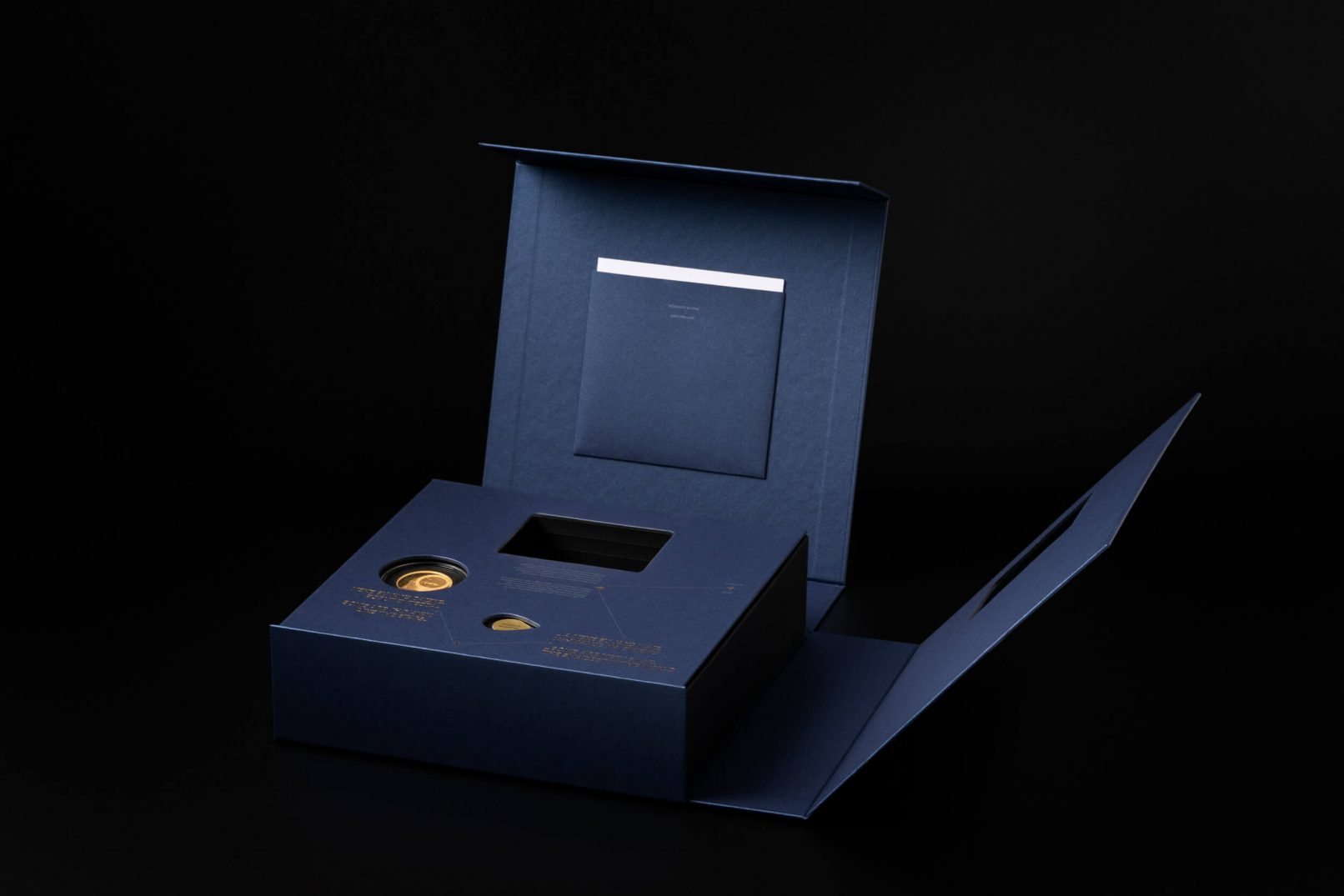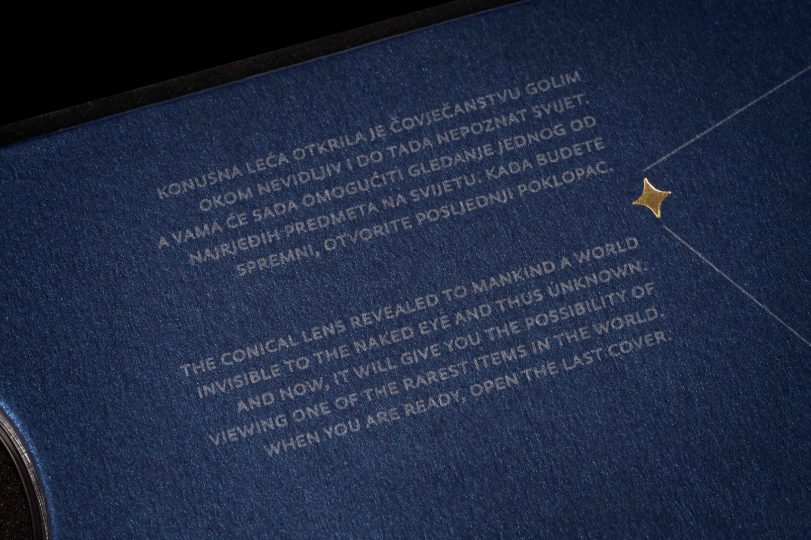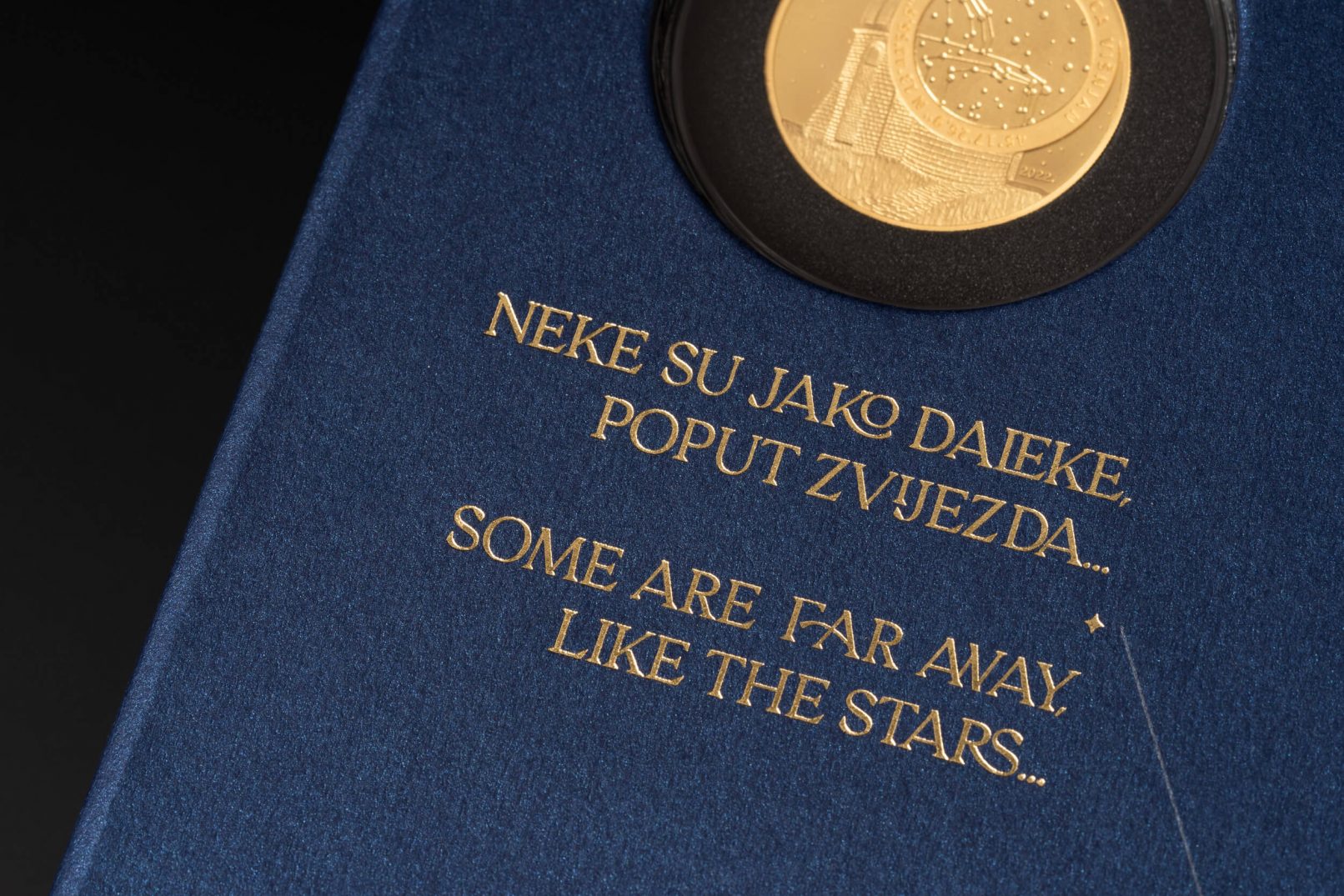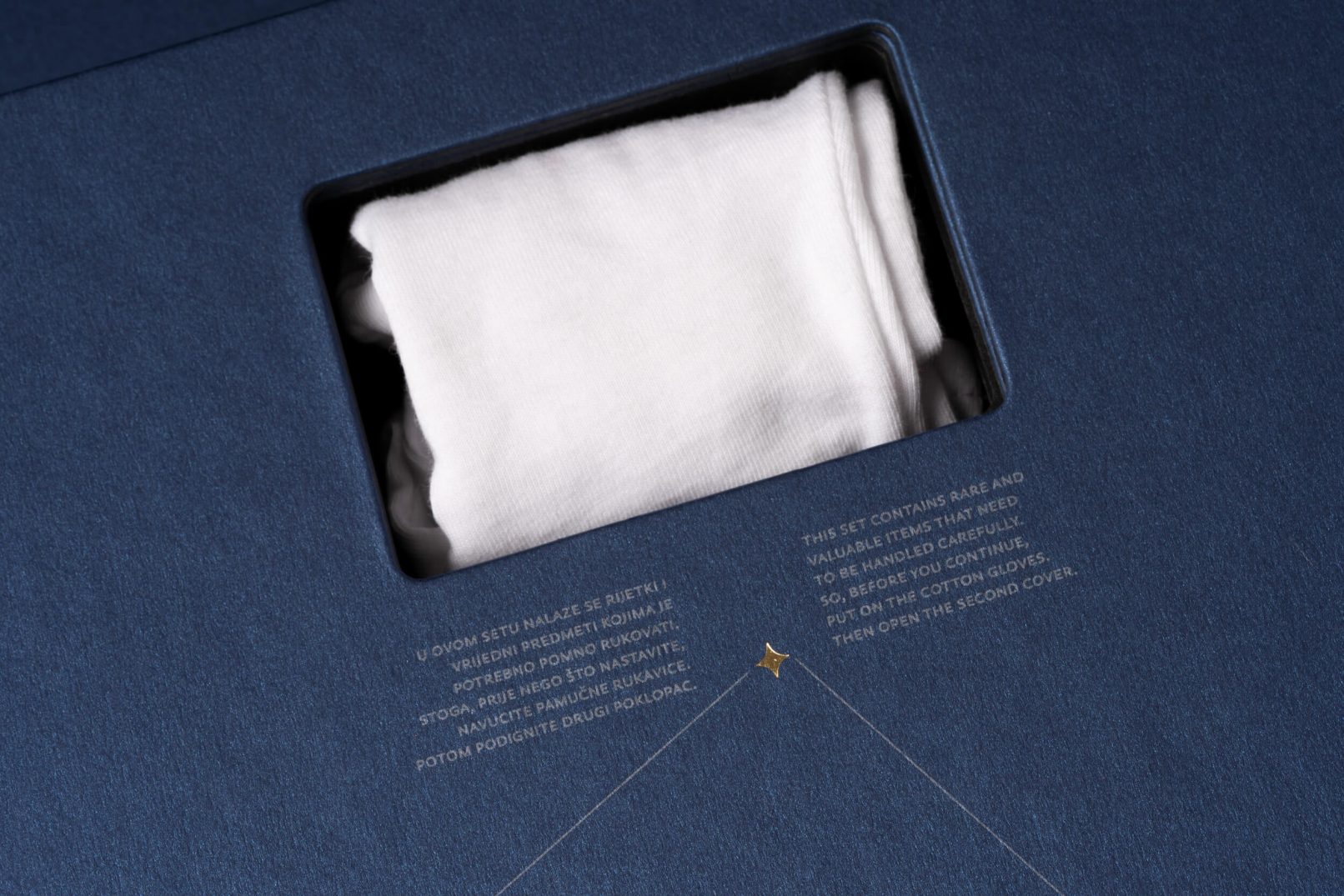 Posebna je pažnja pridana ekskluzivnoj ambalaži u koju je ovaj posebni set smješten: tvrdo kaširana kutija, presvučena specijalnim tamno plavim papirom, rastvara se poput karte i vodi do dragocjenosti, pružajući iskustvo otkrivanja velike vrijednosti. Postupak otvaranja pravi je doživljaj, jer rastvaranjem iz manjeg u veće, svakim se korakom otkriva jedan dio seta kroz koji vodi ispisan zlatni tekst. Potpunim otvaranjem otkrivaju se zlatnici Hum i Zvjezdarnica Višnjan, na podlozi osvijetljenoj mnoštvom malih lampica poput zvjezdanog neba. Uz zlatnike se u kutiji nalaze i zaštitne pamučne rukavice te povećalo za promatranje najmanje kovanice.