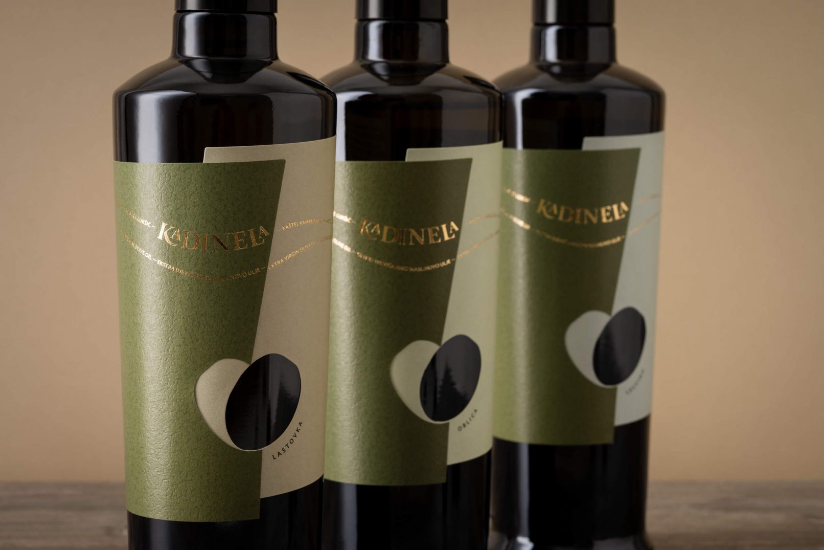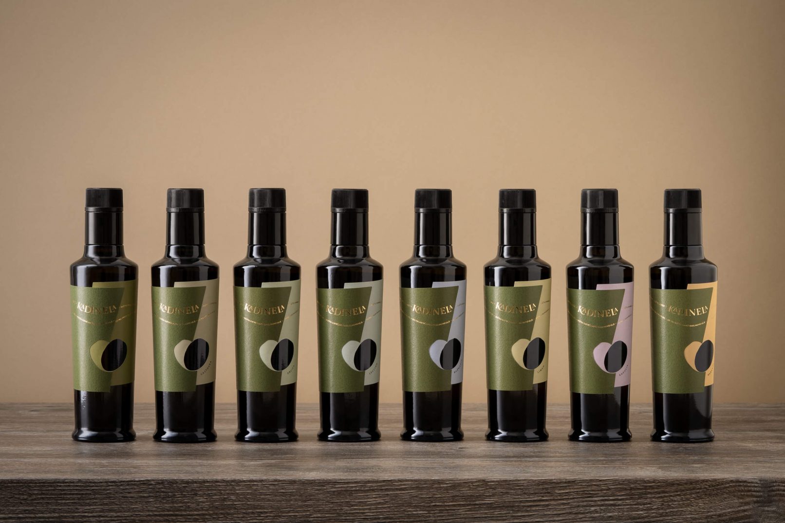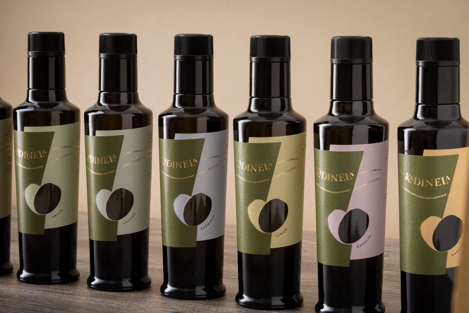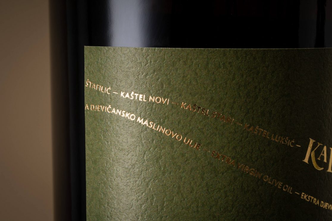 Osnovni element – srce nastalo spajanjem dvije masline, na etiketi je izveden prostorno. Odnos punog i praznog dijela dvije preklopljene etikete donose novu dimenziju, a različite strukture i tonovi papira naglašavaju spoj. Proizvodi unutar podlinija sortnih i aromatiziranih ulja kodirani su pastalnim bojama i nazivom.