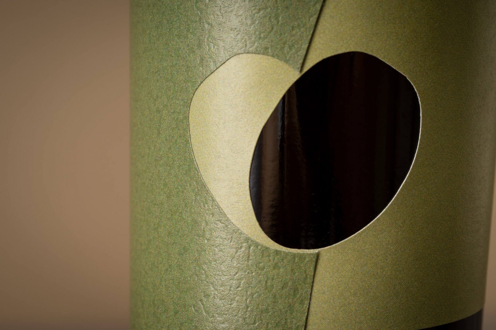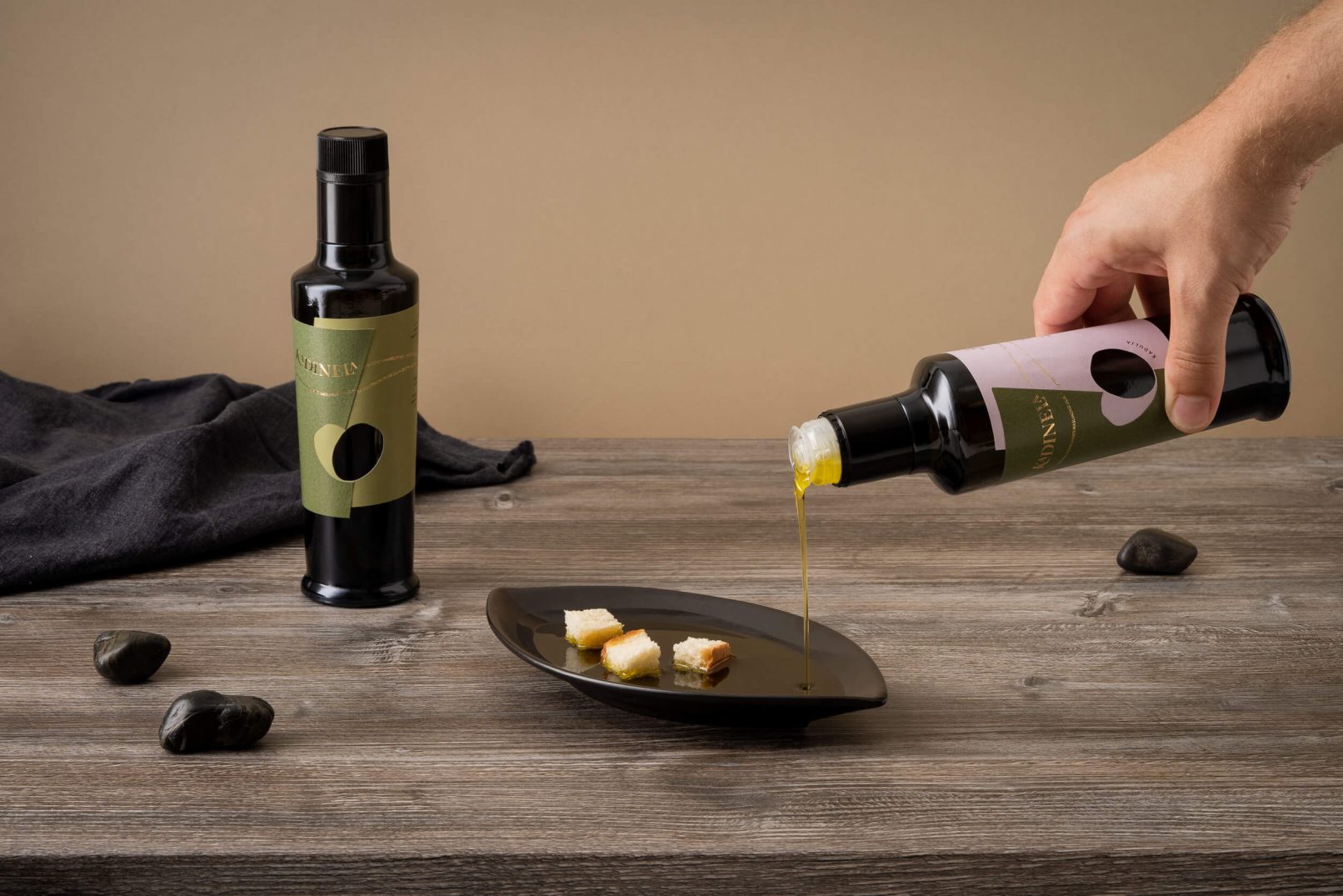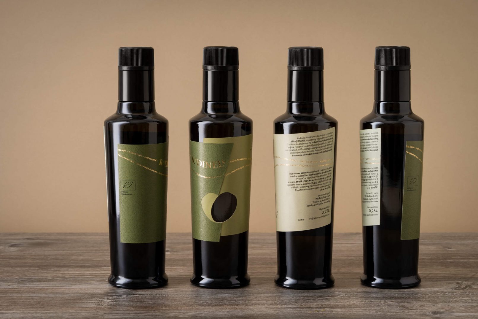 Osnovni element – srce nastalo spajanjem dvije masline, na etiketi je izveden prostorno. Odnos punog i praznog dijela dvije preklopljene etikete donose novu dimenziju, a različite strukture i tonovi papira naglašavaju spoj. Proizvodi unutar podlinija sortnih i aromatiziranih ulja kodirani su pastalnim bojama i nazivom.