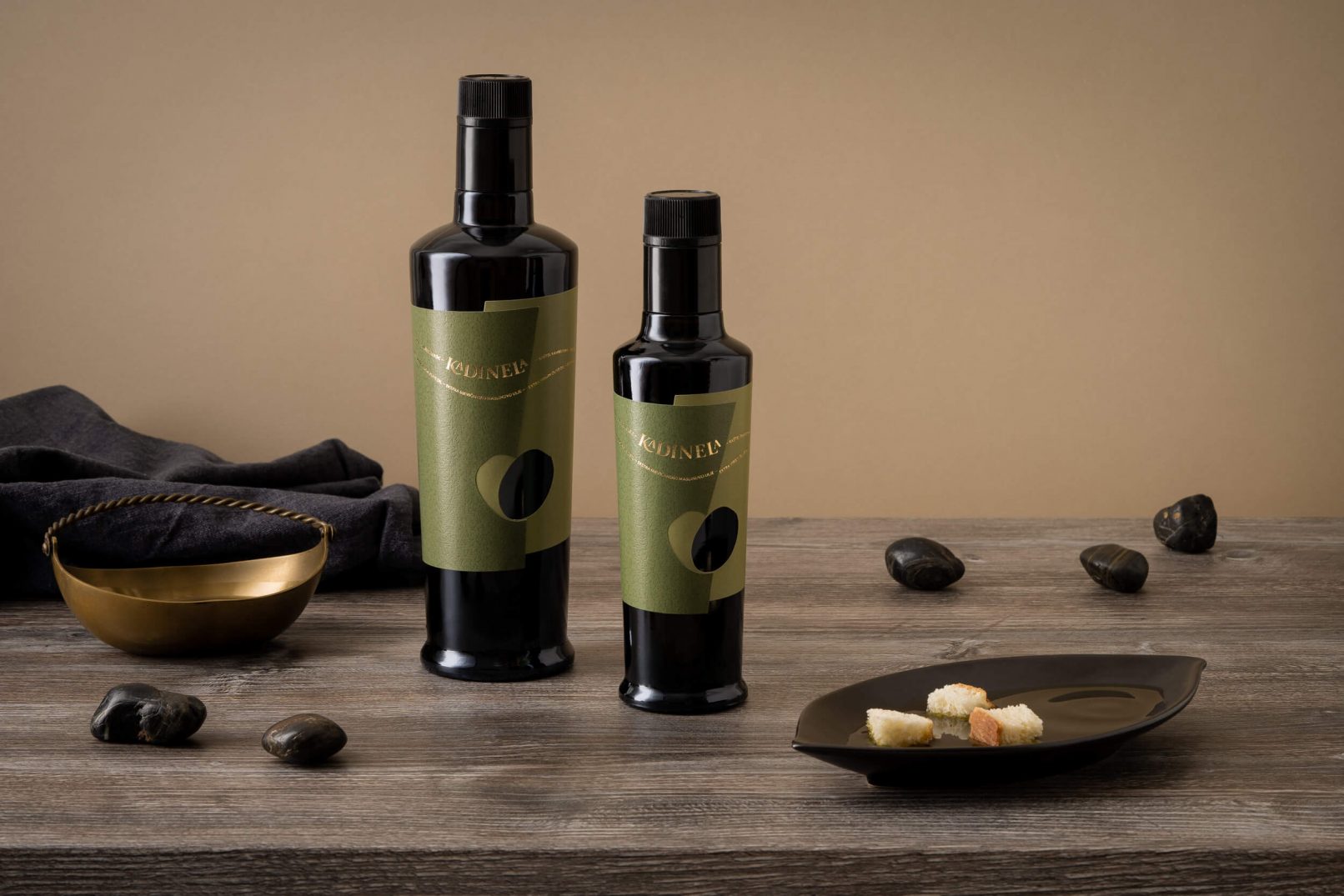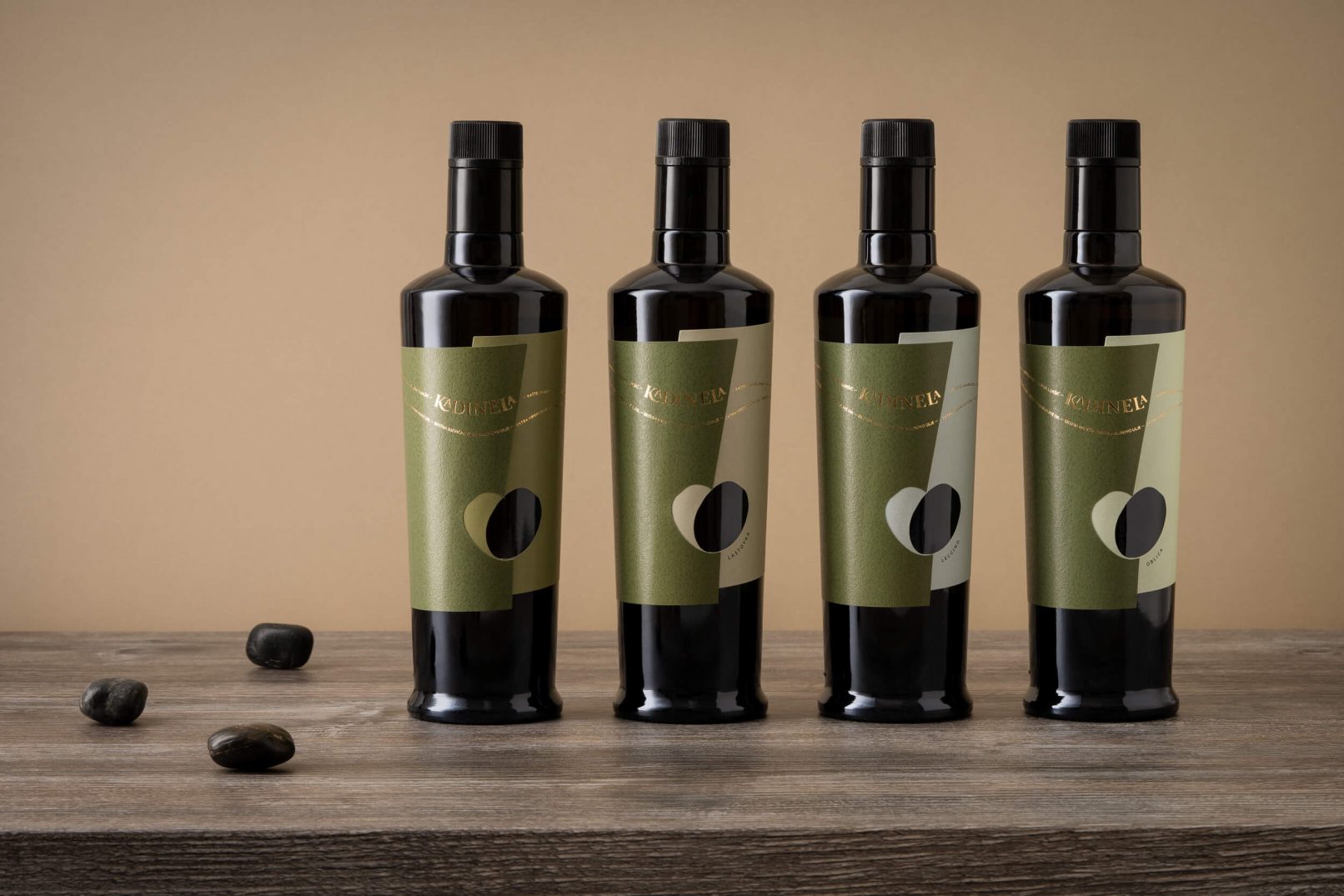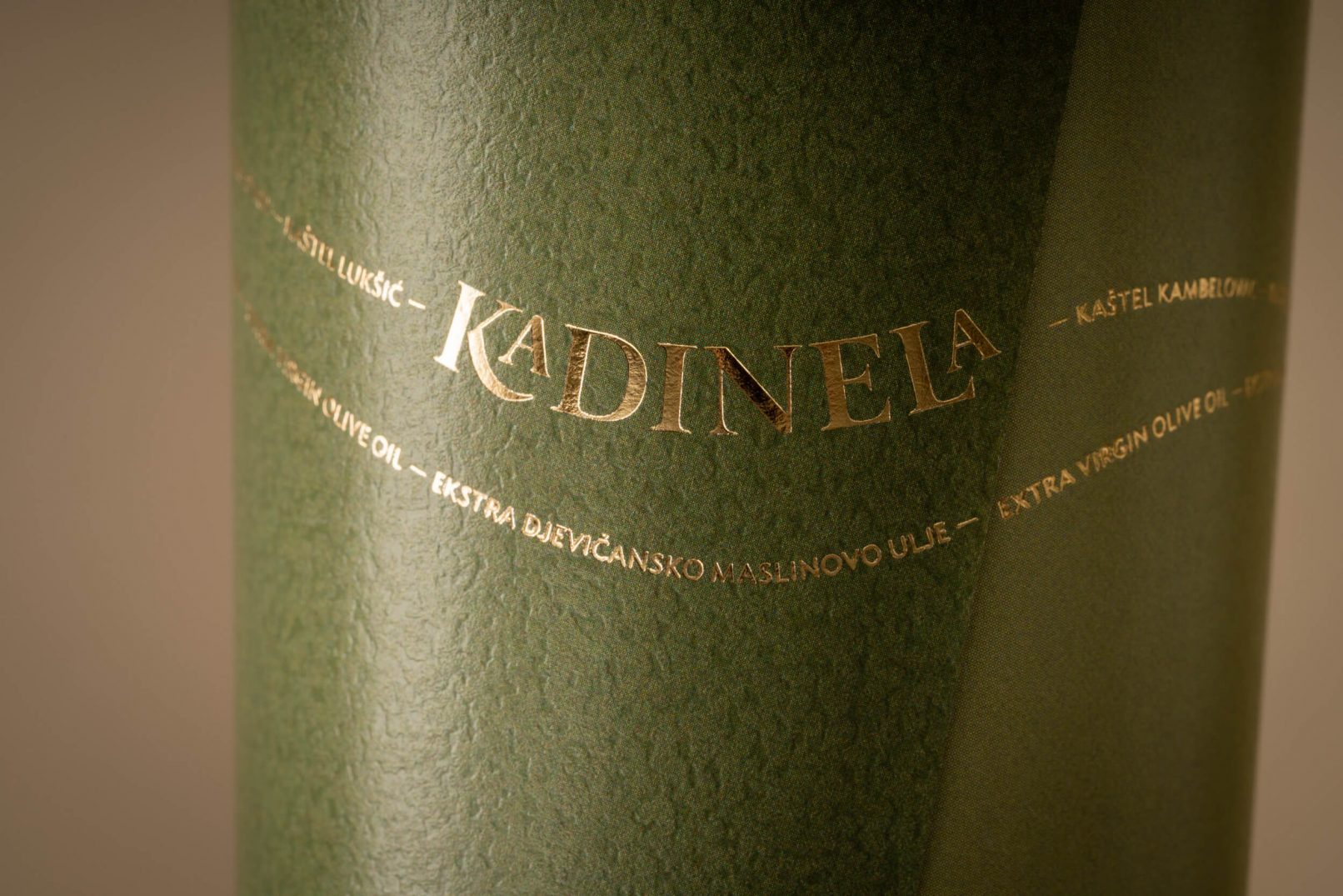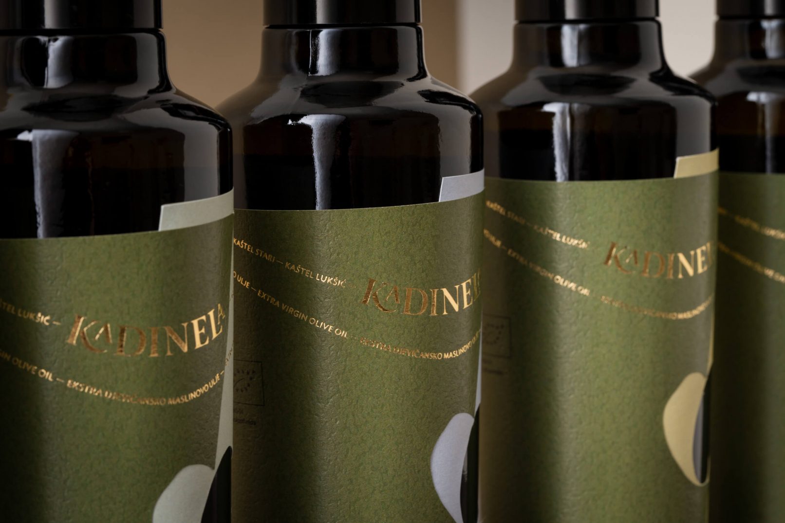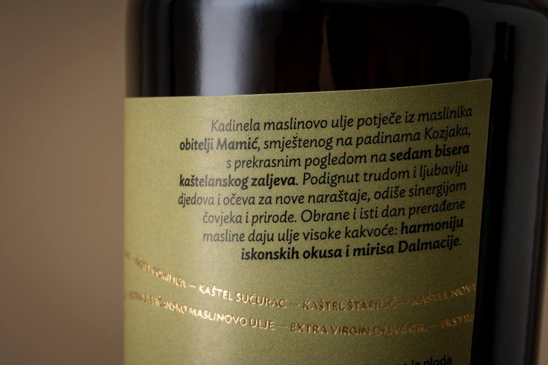 Osmišljano ime brenda – Kadinela, stari je izraz iz kaštelanskog i splitskog govora koji znači lančić. Melodičnost izgovora asocira na Dalmaciju, a smisao predstavlja sedam Kaštela nanizanih uz obalu,pa su bitan dio identiteta nazivi svih Kaštela koji s logotipom čine lančić. Ideja “iz ljubavi” ilustrira spajanje dvije masline koje preklapanjem formiranju srce. Tako i priča o ljubavi Miljenka i Dobrile, i spajanju dvije obitelji maslinara, dobiva sretan kraj.