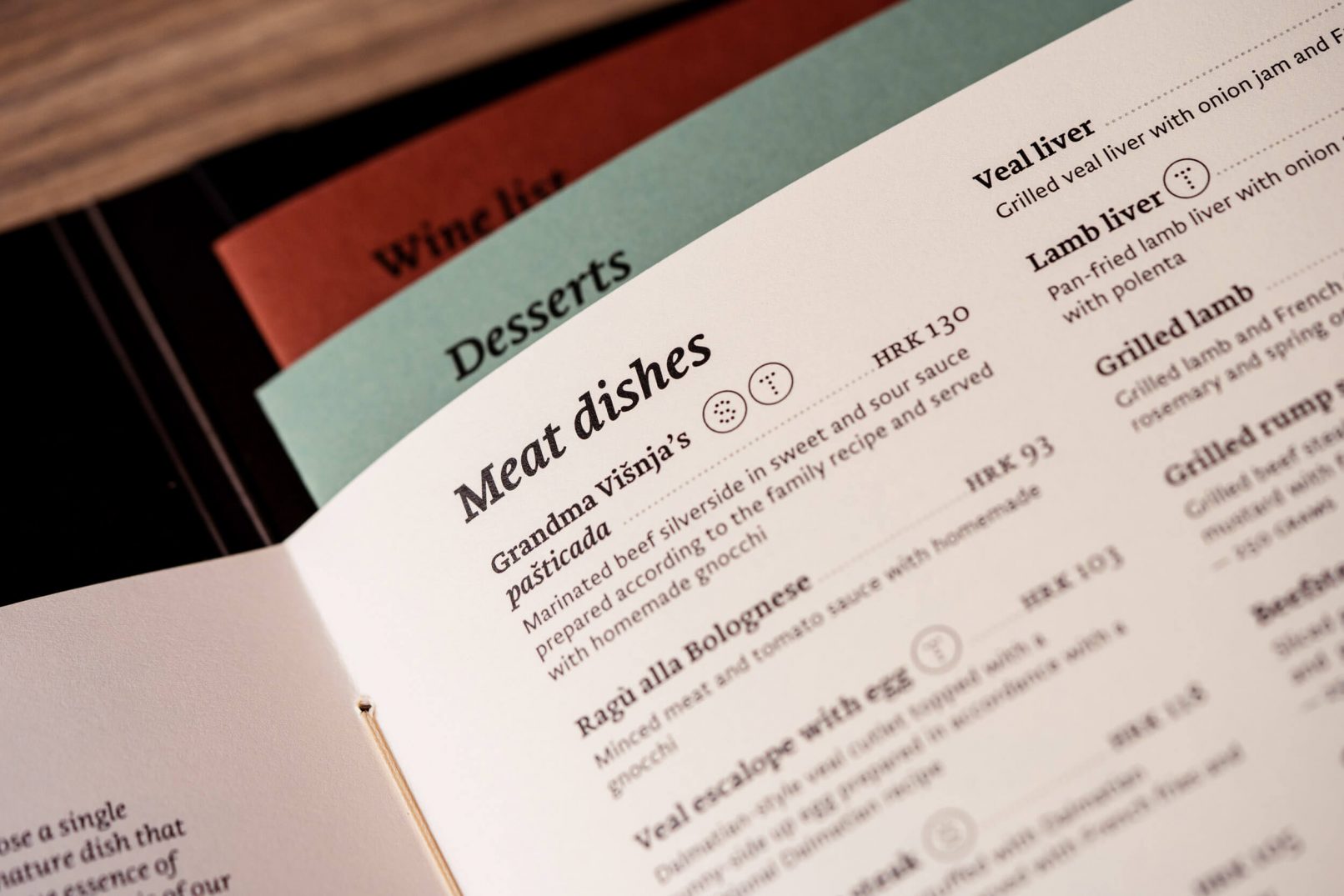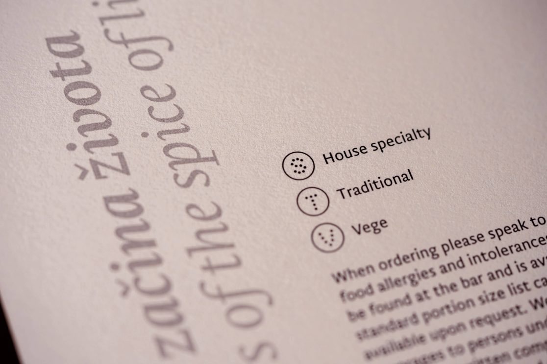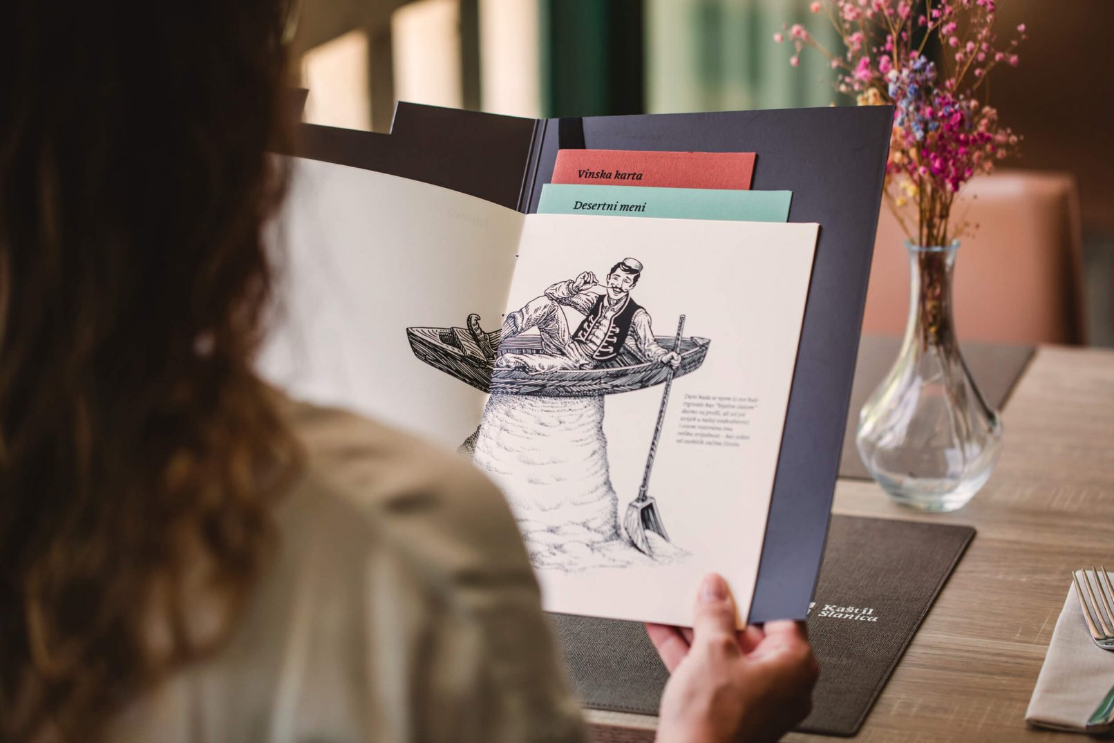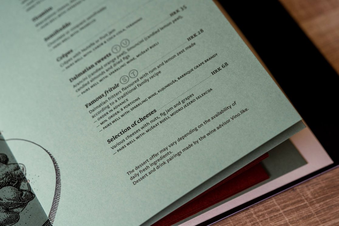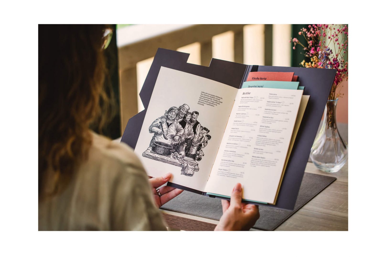 Meni i promotivni materijali nadopunjeni su ilustracijama i tekstom koji zajedno prenose priče lokaliteta i gastronomske ponude. Projekt uključuje i dizajn opreme restorana, fotografije jela i postava stola, dizajn suvenir ponude, unutarnju i vanjska signalizacija te brendiranje specifičnih elemenata prostora.