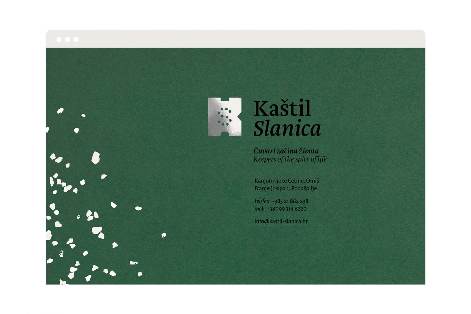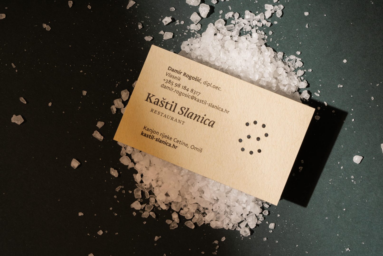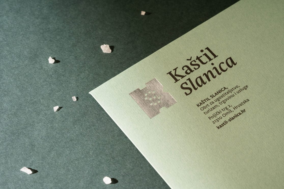 Identitet je u osnovi jednostavan i elegantan, a elementi i interijer upotrebom boja i materijala komuniciraju emociju, tradiciju, lokalnu gastronomiju i prirodne ljepote. Identitet postavlja osnovu za razvedenu komunikaciju, pomalo dramatično, ali emotivno i primamljivo gradi priču i omogućuje nadogradnju usluga Kaštil Slanice.