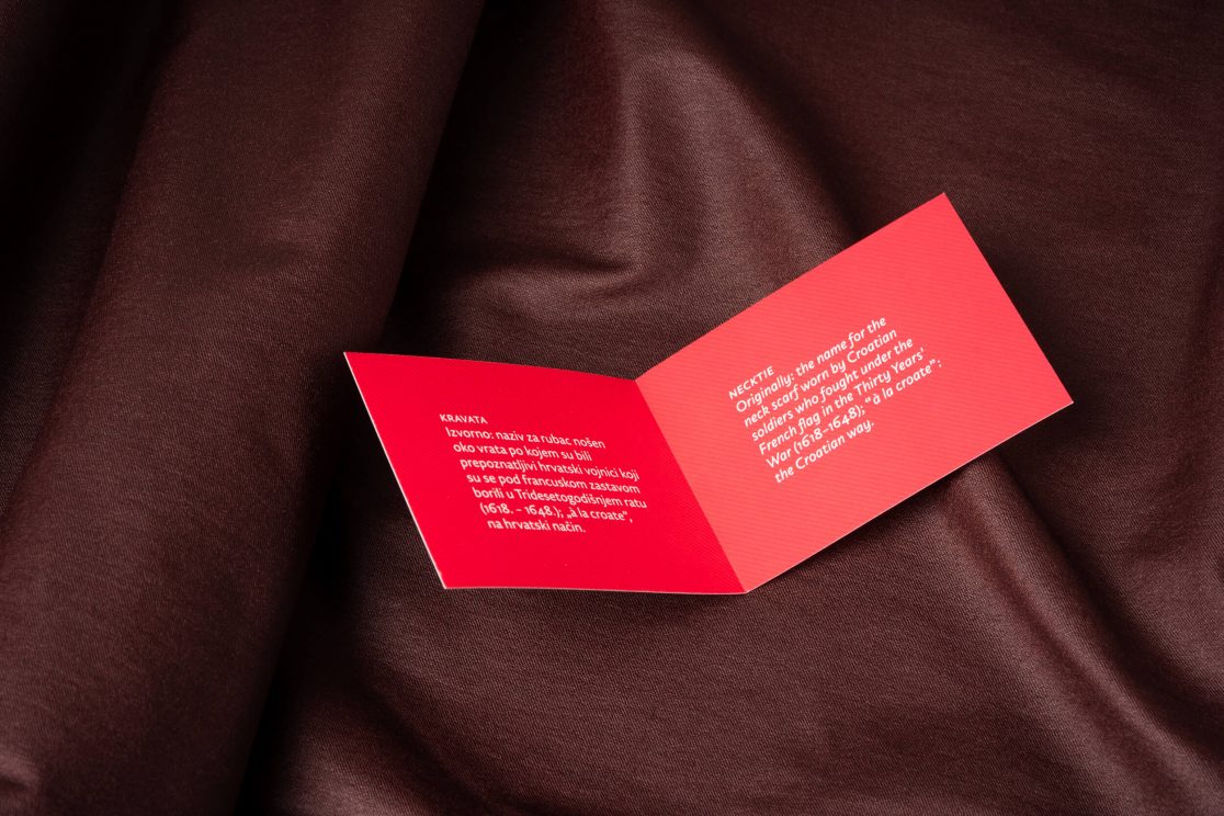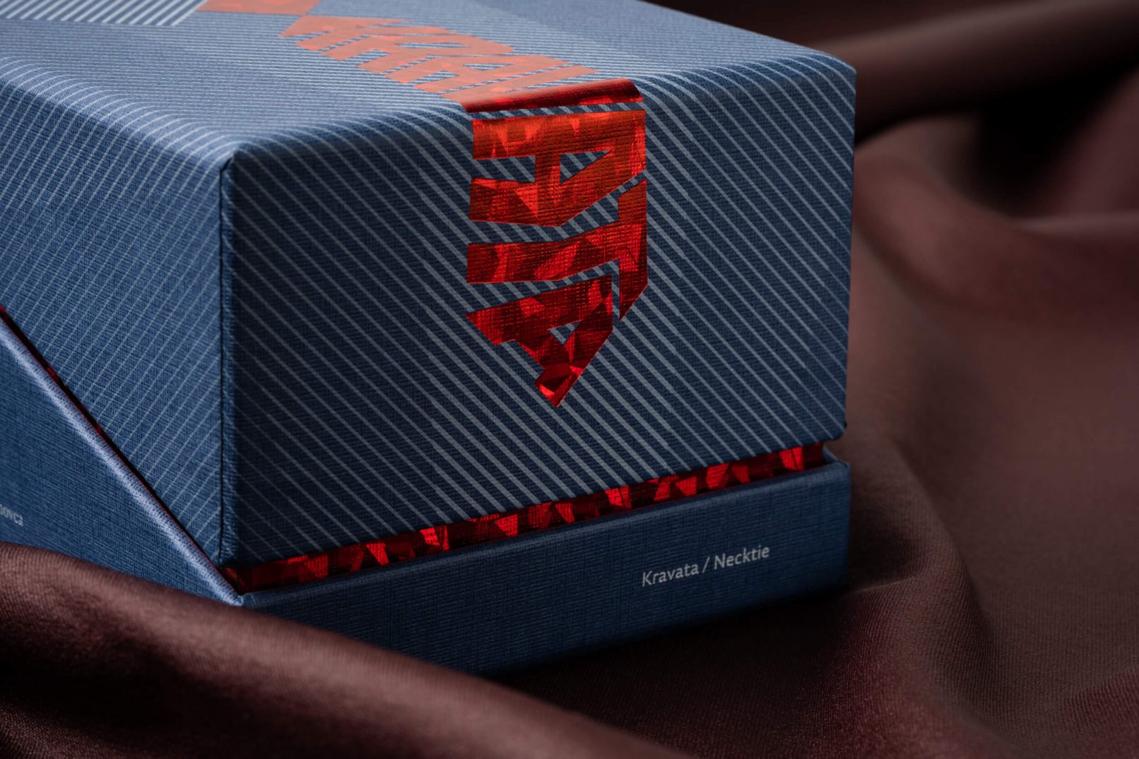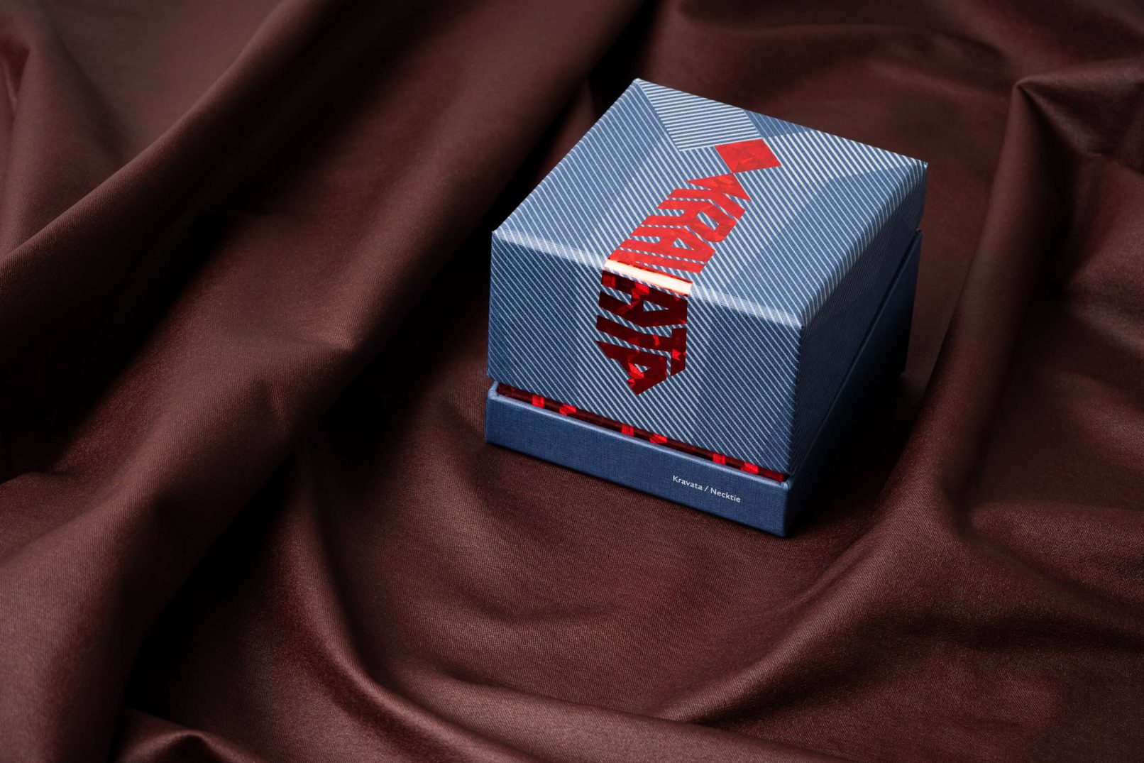 Ambalaža proizvoda zamišljena je kao hommage ovom ikoničnom modnom i kulturnom predmetu. Tvrdo kaširana kutija presvučena je tamno plavim odijelom i na sebi nosi crvenu kravatu sastavljena od slovnih znakova riječi “kravata”. Odabrani papir ima teksturu tkanine, a sama kravata izvedena je u crvenoj hologramskoj foliji s uzorkom.