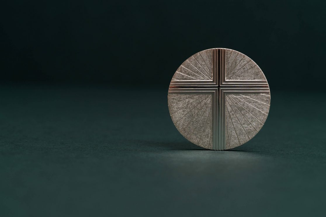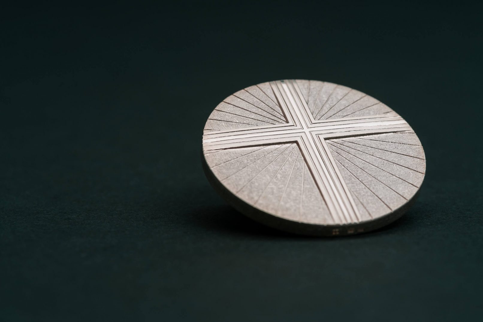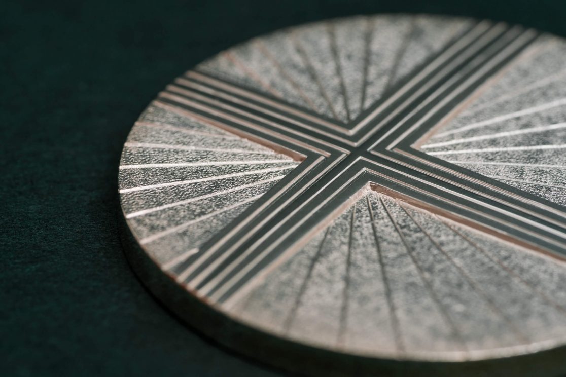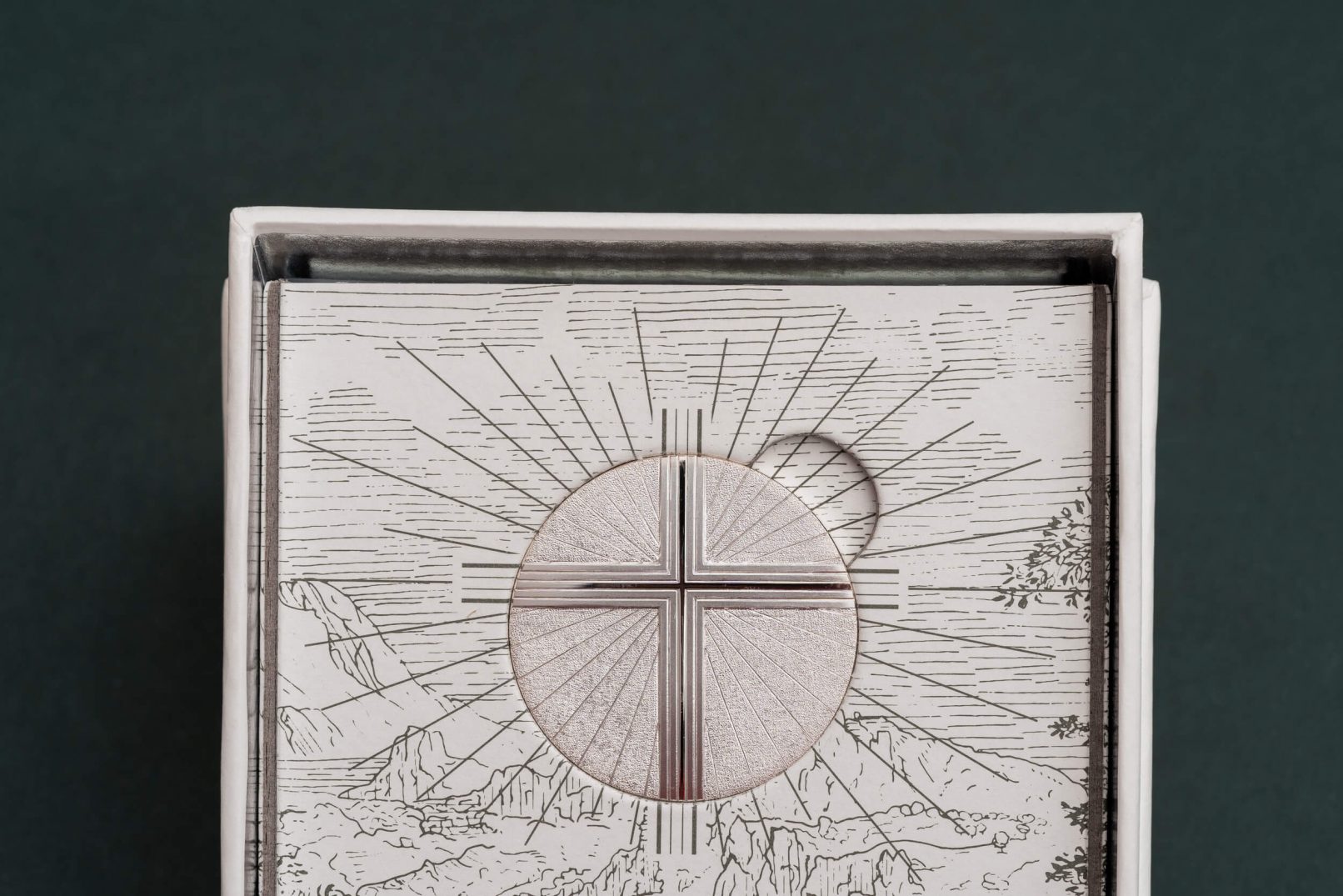 Prednja strana medalje suvremena je interpretacija osnovnog kršćanskog simbola – križa, dok je stražnja strana predviđena za personalizaciju. Dizajn koristi kontrast sjaj i mat površina te suptilne gravirane strukture za prikaz slojevitosti teme unutar čiste geometrijske forme.