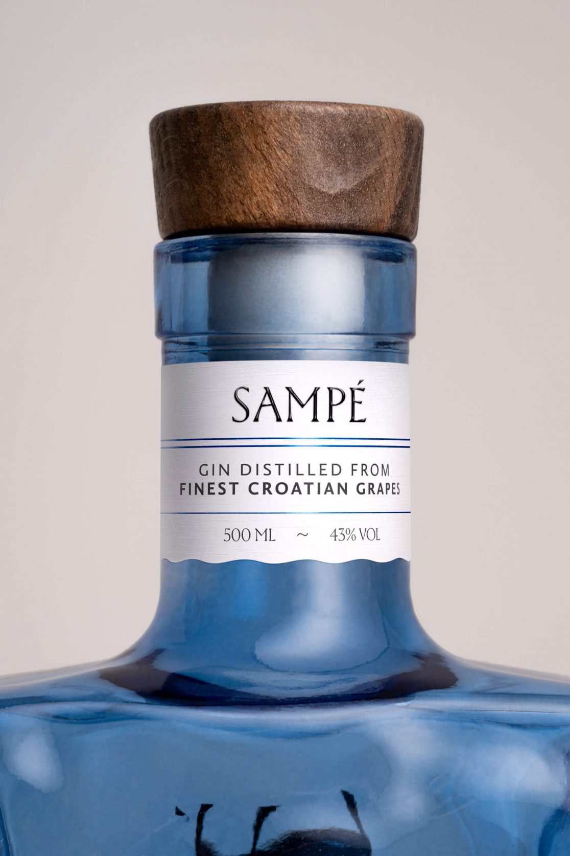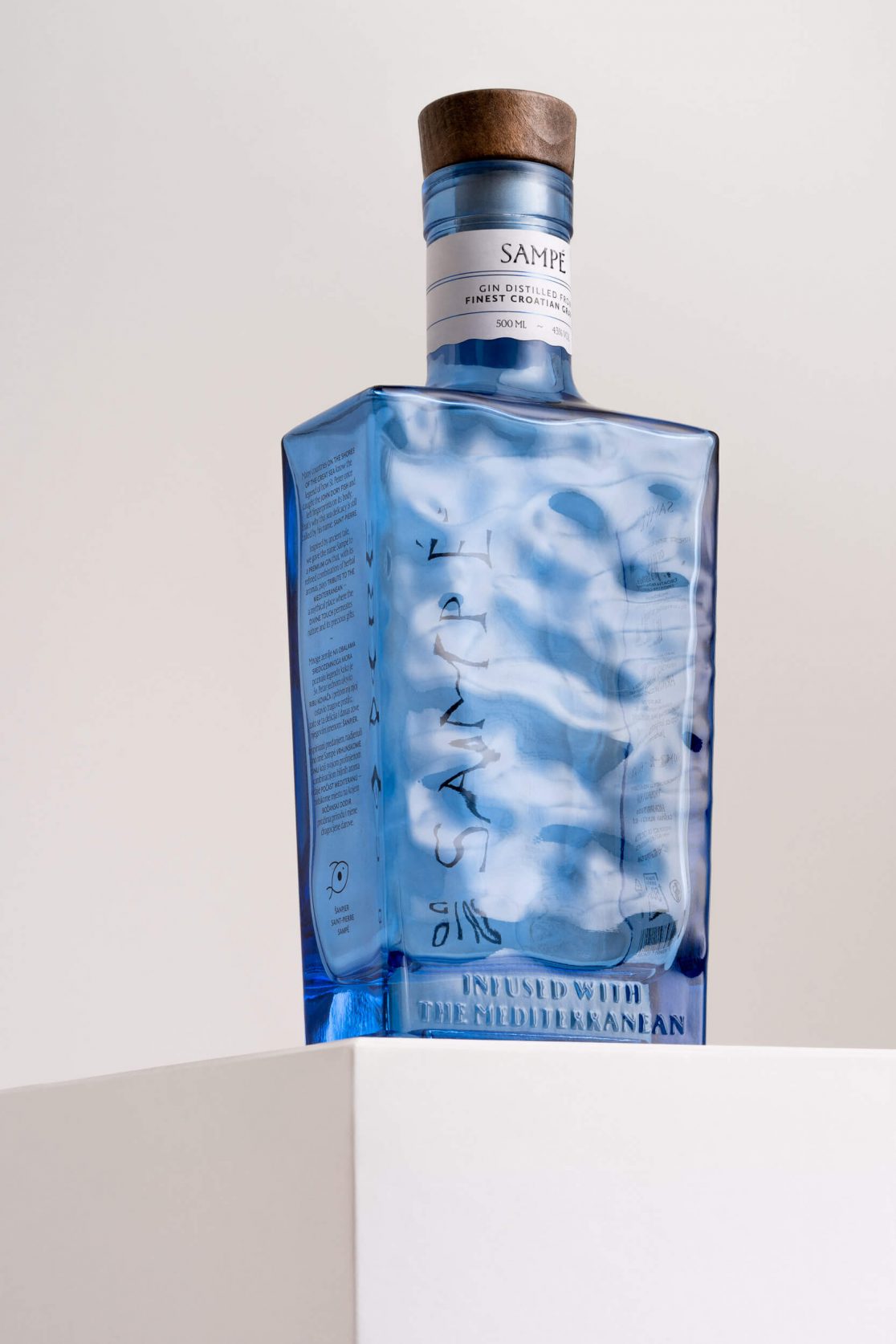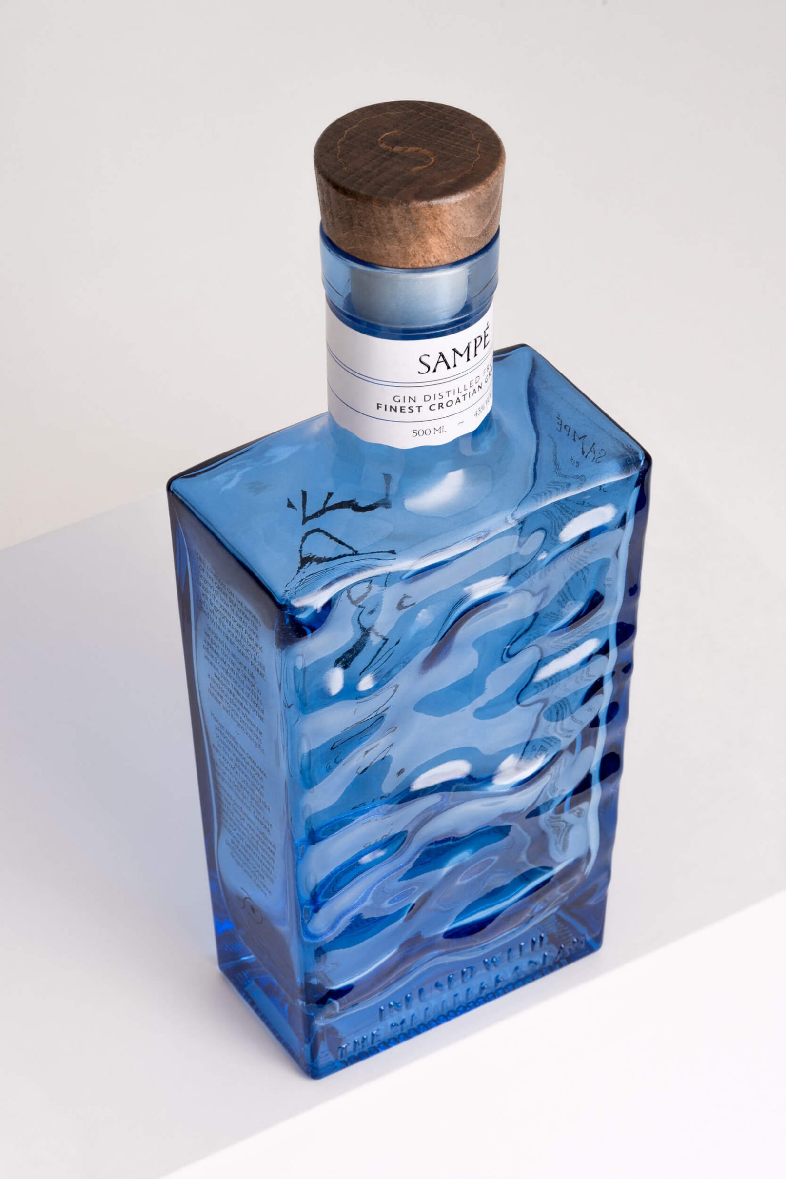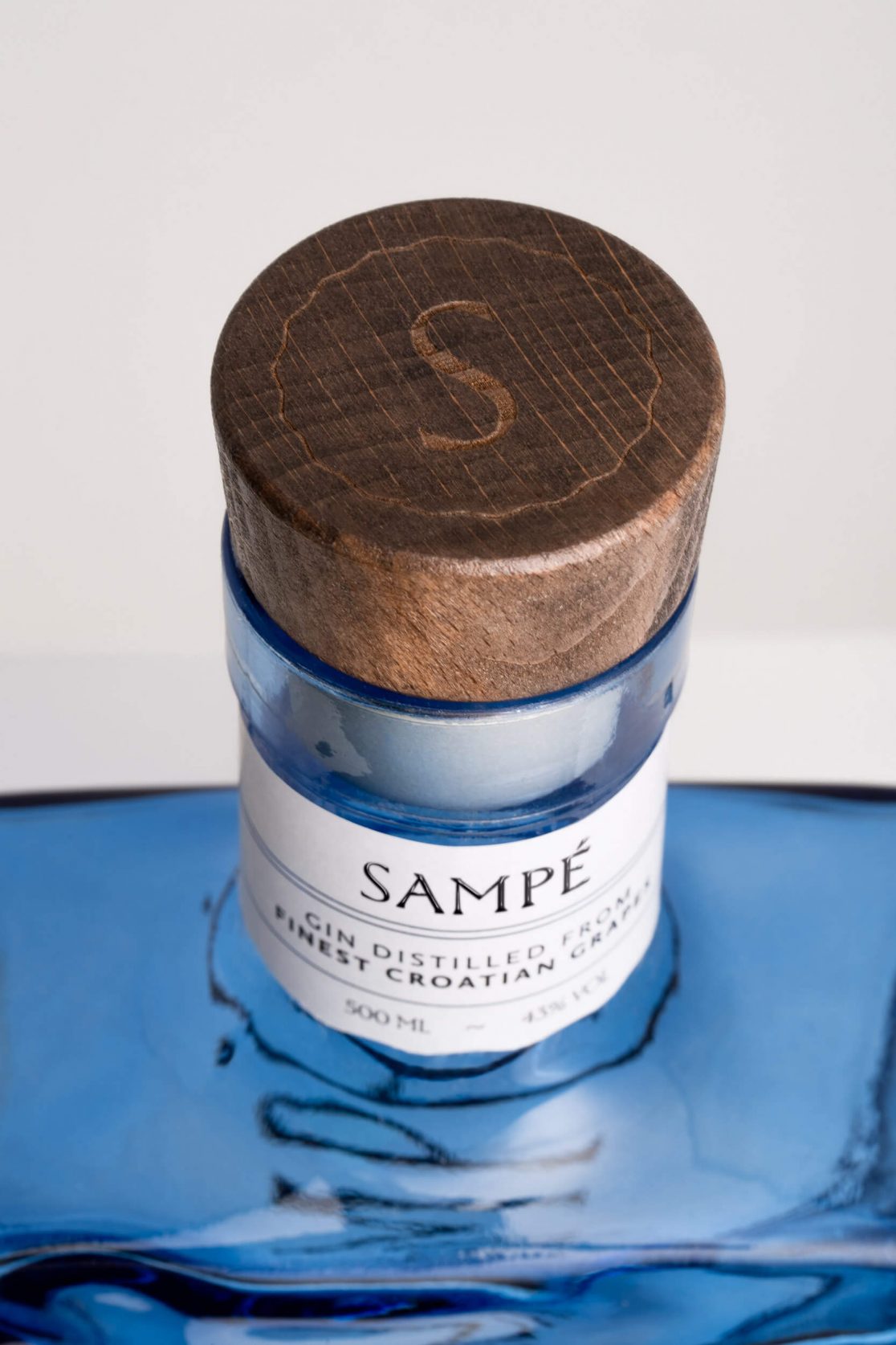 Originalno dizajnirana boca s prednje strane ima oblik morske površine. Ime brenda otisnuto je zrcalno na stražnjoj strani boce, tako da se na prednjoj strani vidi kroz morske valove i tekućinu gina što daje dojam da je naziv brenda Sampé u vodi. Ova pozicija deformira tipografiju i stvara uzbudljive oblike i strukture koje se mijenjaju okretanjem boce u ruci ili promjenom kuta gledanja. Korištena tipografija Rector, čiji je autor Hrvoje Živčić, odabrana je radi idealnog spoja monumentalnog i gracioznog.
