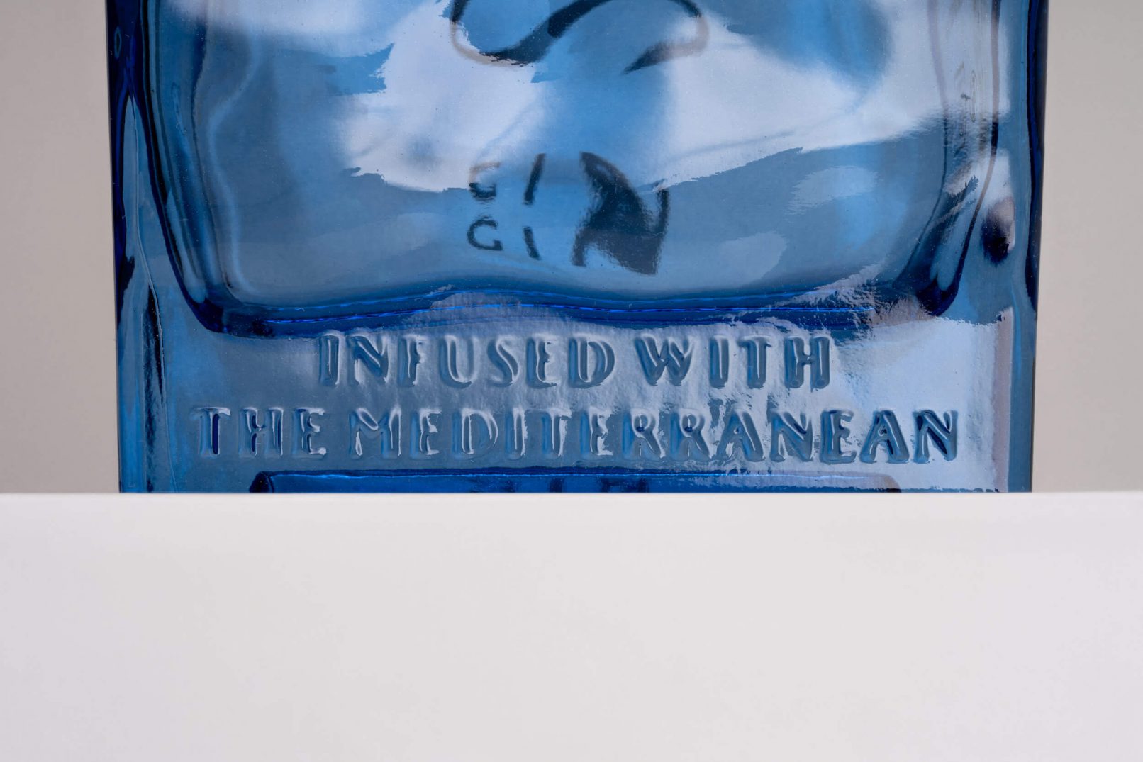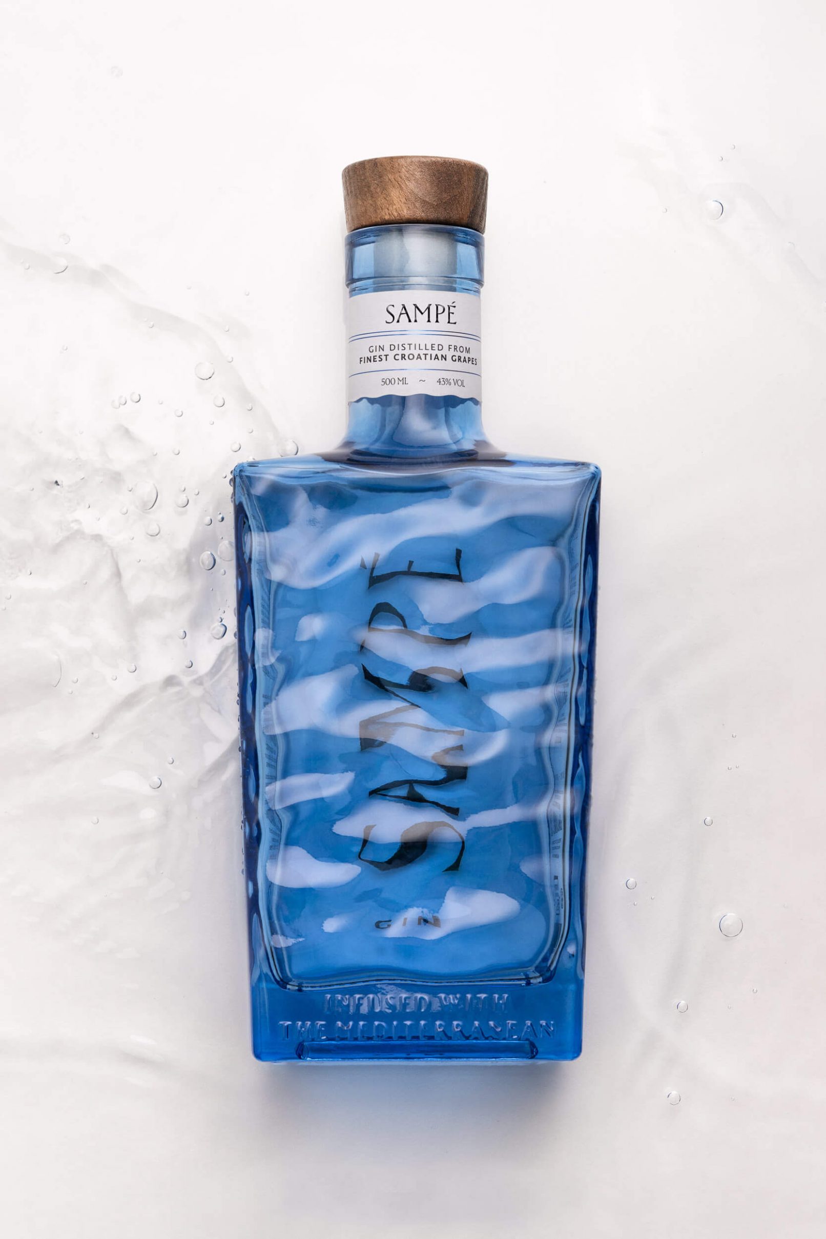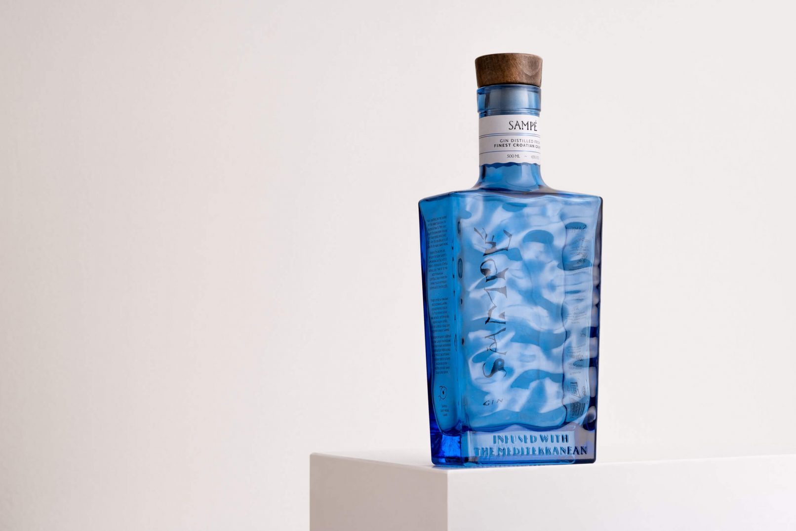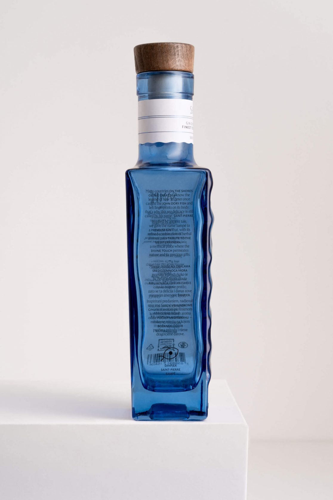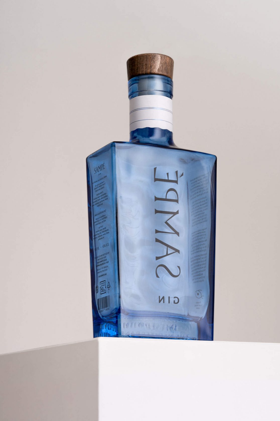 Originalno dizajnirana boca s prednje strane ima oblik morske površine. Ime brenda otisnuto je zrcalno na stražnjoj strani boce, tako da se na prednjoj strani vidi kroz morske valove i tekućinu gina što daje dojam da je naziv brenda Sampé u vodi. Ova pozicija deformira tipografiju i stvara uzbudljive oblike i strukture koje se mijenjaju okretanjem boce u ruci ili promjenom kuta gledanja. Korištena tipografija Rector, čiji je autor Hrvoje Živčić, odabrana je radi idealnog spoja monumentalnog i gracioznog.