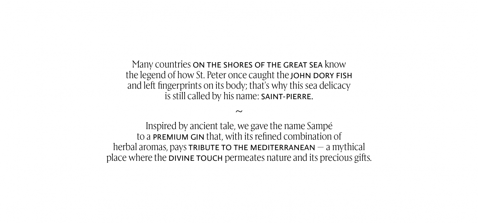 Mnoge zemlje na obalama Sredozemnog mora poznaju legendu kako je Sv. Petar jednom ulovio ribu Kovača i pritom na njoj ostavio tragove prstiju; zato se ta morska delicija i danas zove njegovim imenom: Šanpjer, Sant-Pierre, Sampé. Inspirirani predanjem, nadjenuli smo ime Sampé vrhunskom ginu koji odaje počast Mediteranu — mitskome mjestu na kojem božanski dodir prožima prirodu i njene dragocjene darove.