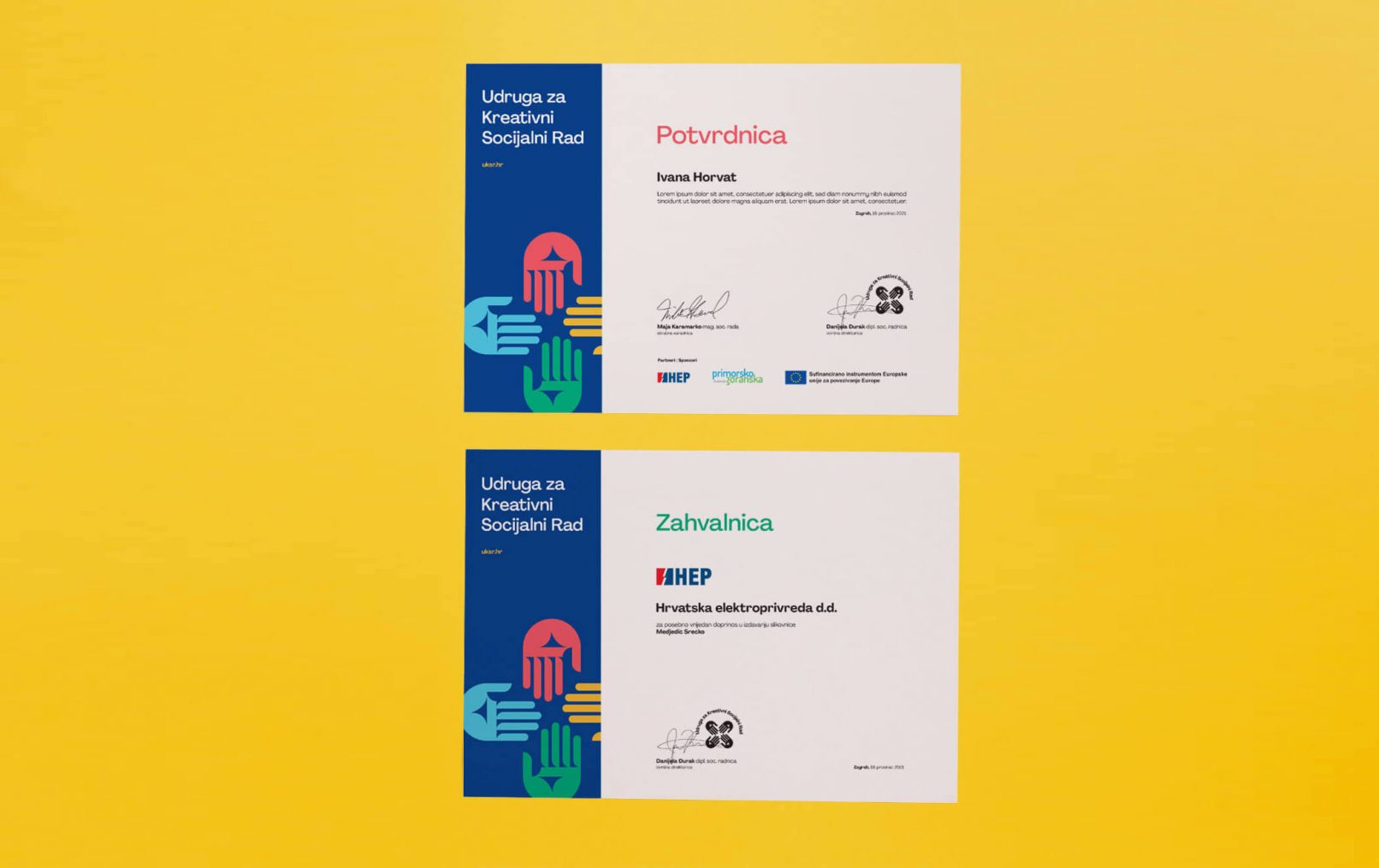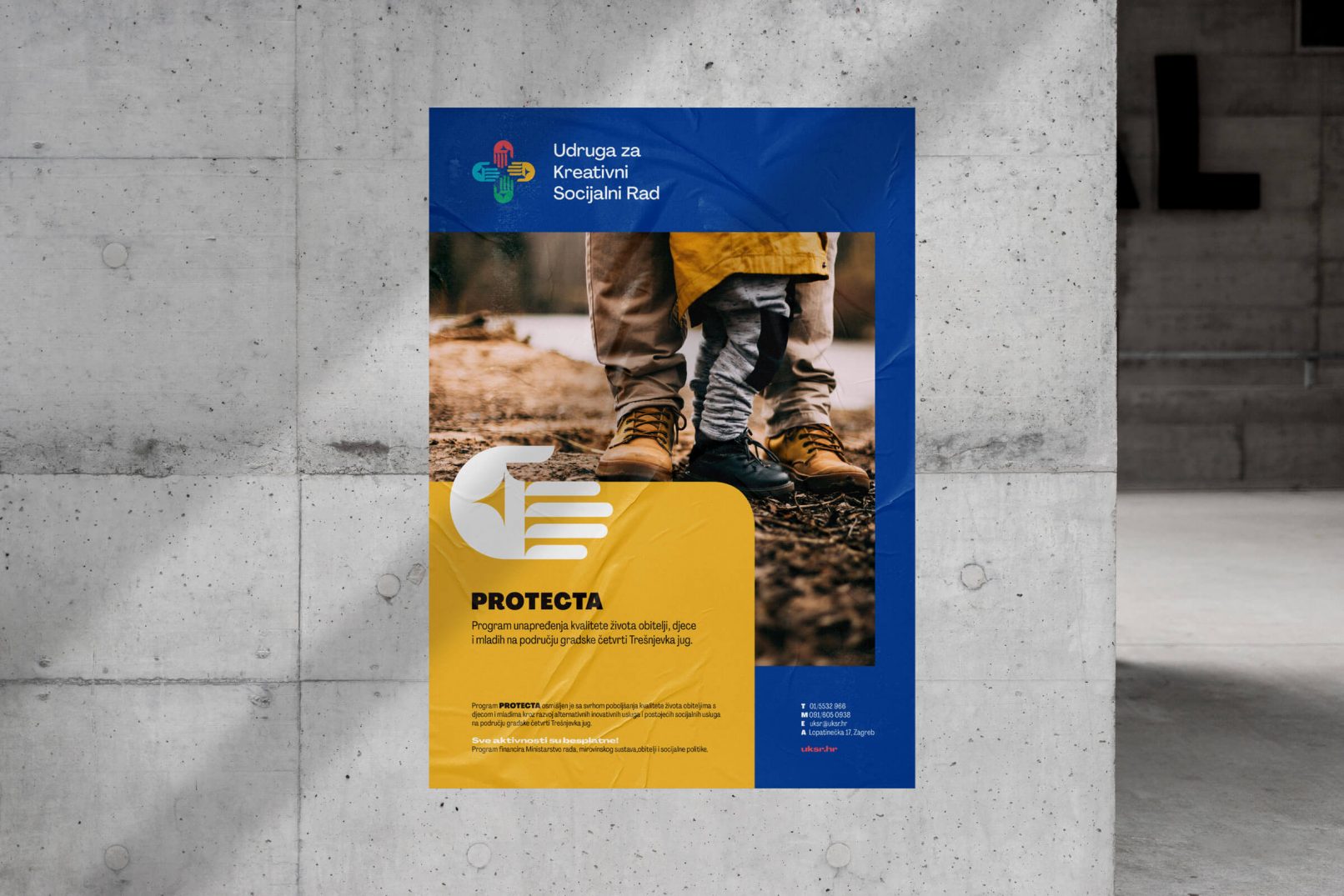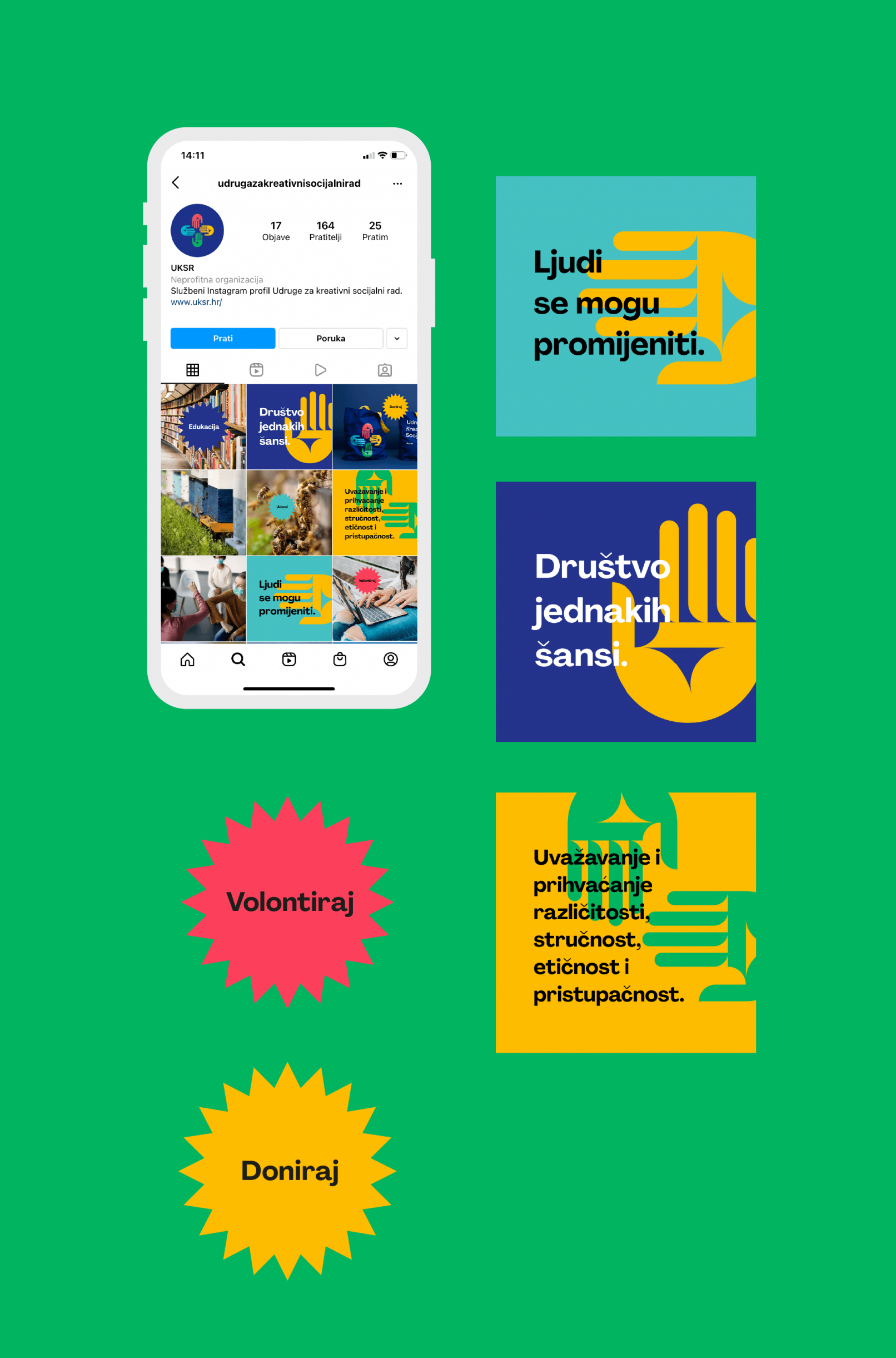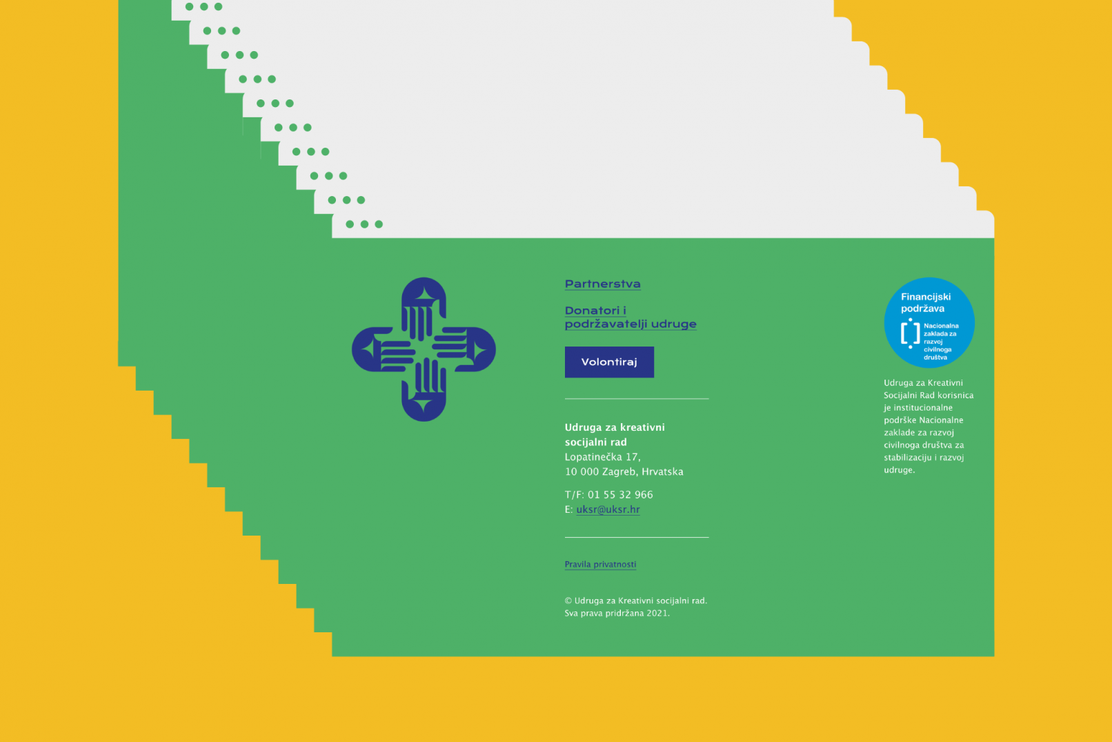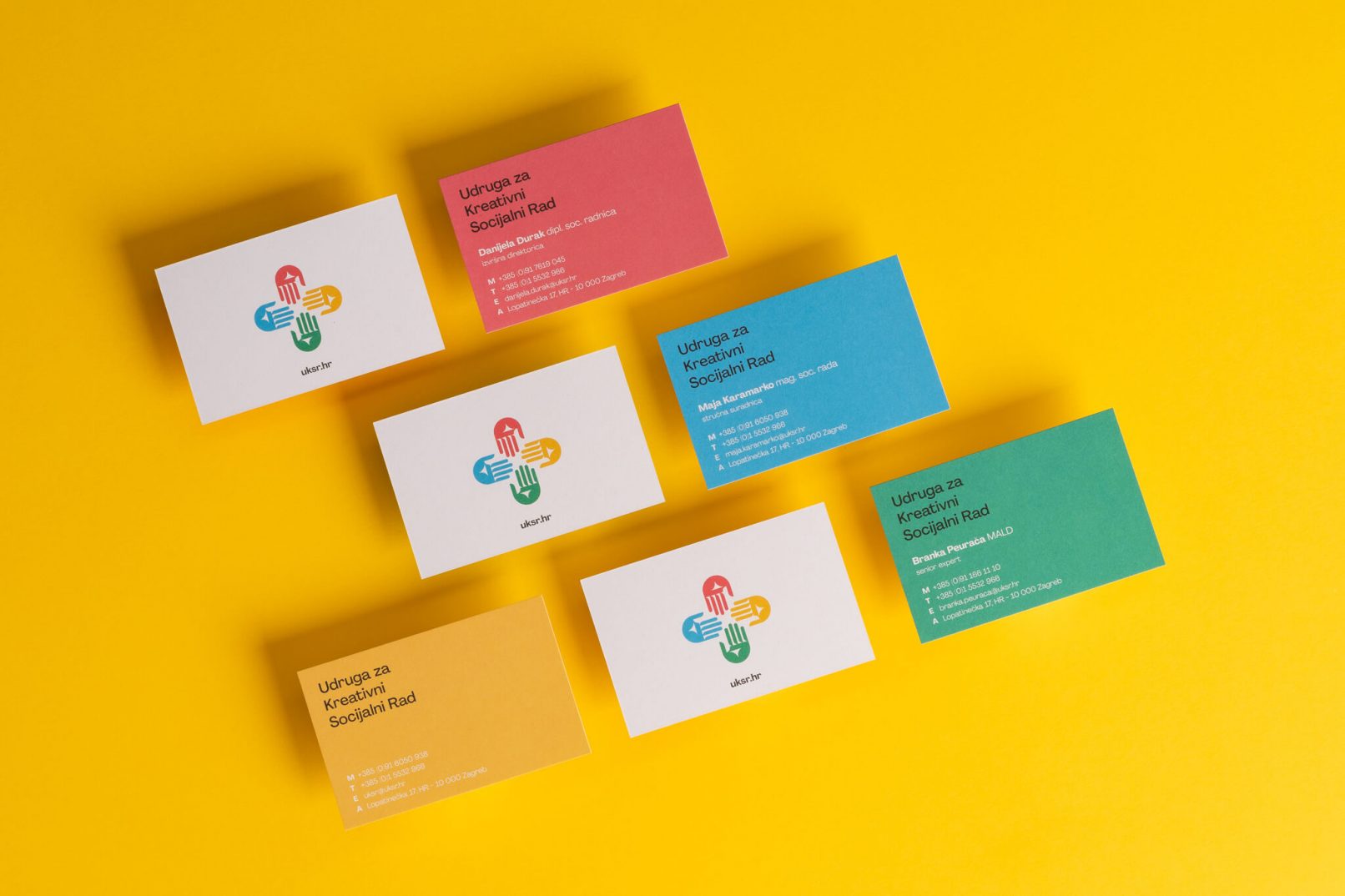 Redizajnom vizualnog identiteta Udruge za kreativni socijalni rad zadržao se osnovni motiv – ruke, ali tako da su orijentirane jedna prema drugoj i zajednički tvore formu križa, komunicirajući podršku i pomoć u kriznim situacijama, što je i osnova djelovanja Udruge.