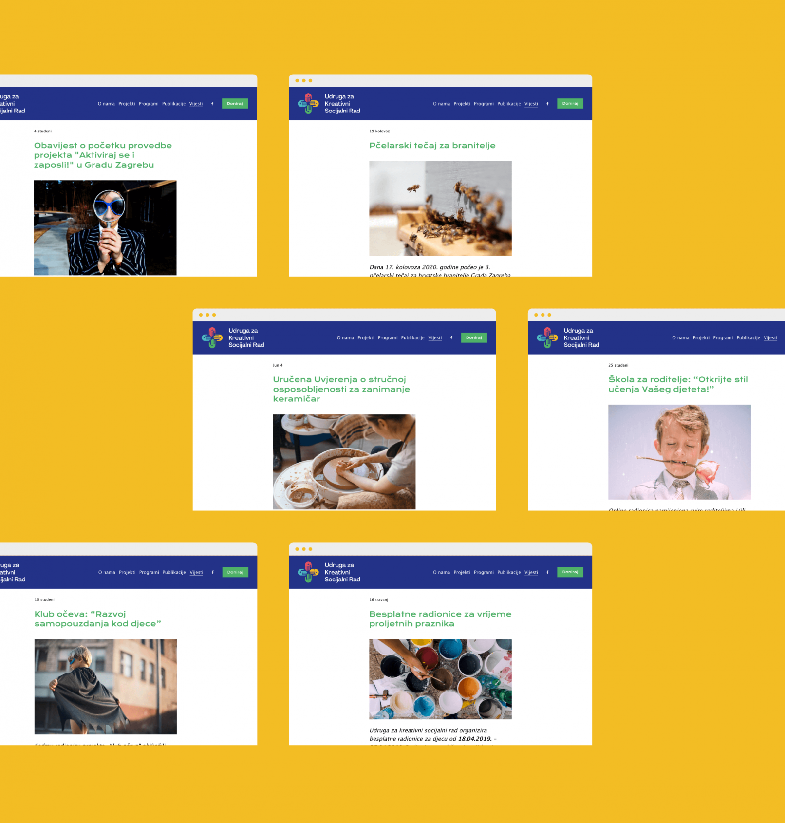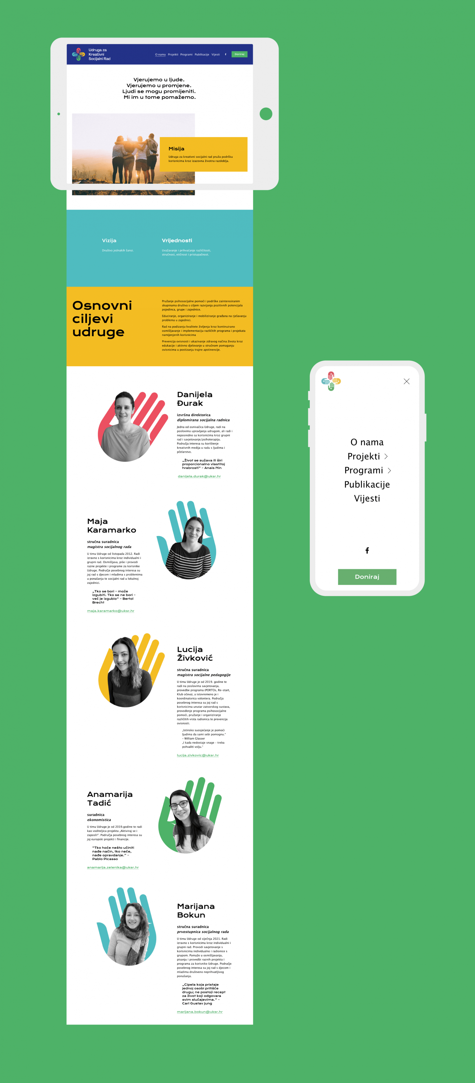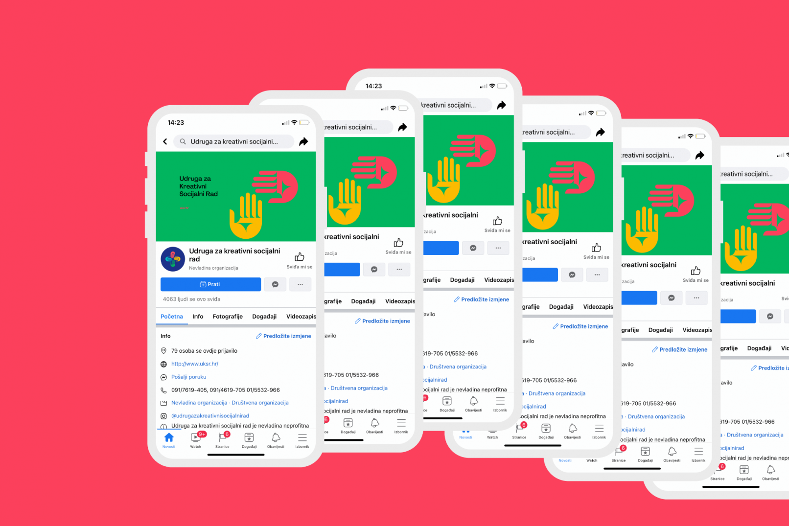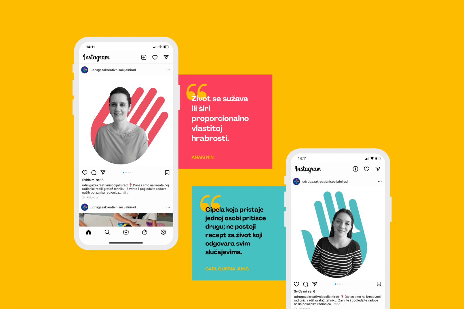 Redizajnom vizualnog identiteta Udruge za kreativni socijalni rad zadržao se osnovni motiv – ruke, ali tako da su orijentirane jedna prema drugoj i zajednički tvore formu križa, komunicirajući podršku i pomoć u kriznim situacijama, što je i osnova djelovanja Udruge.