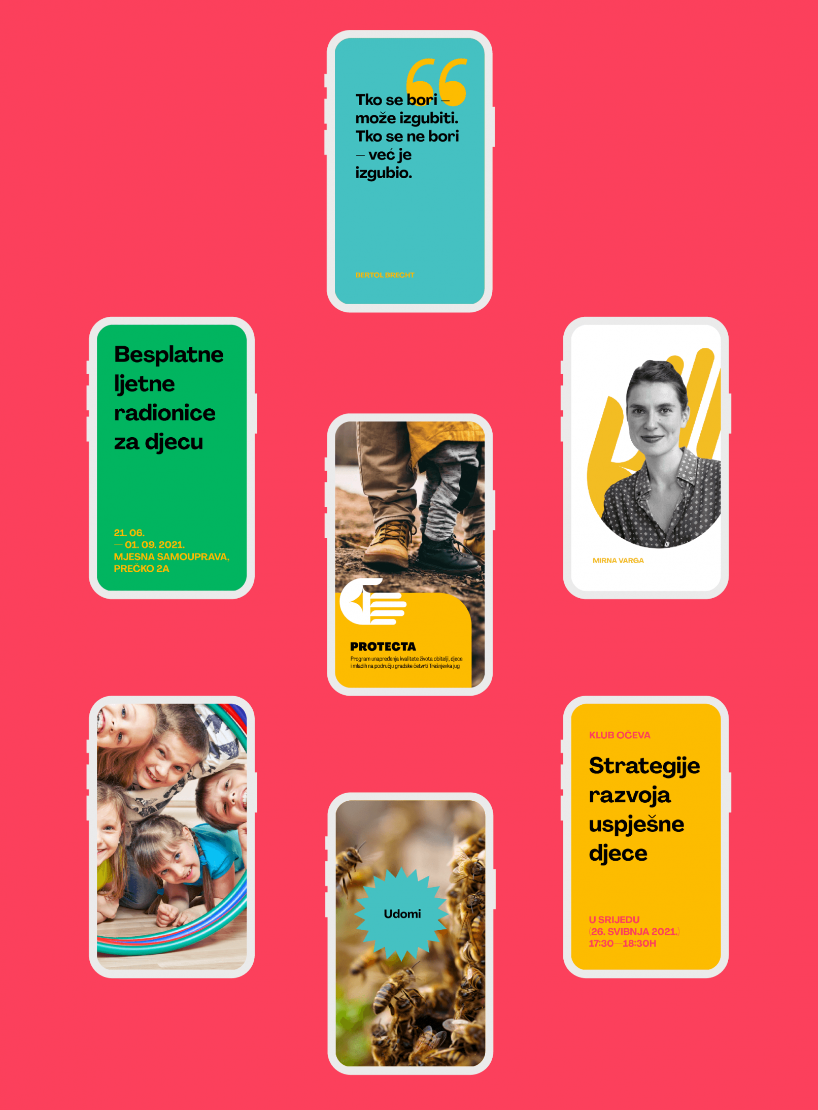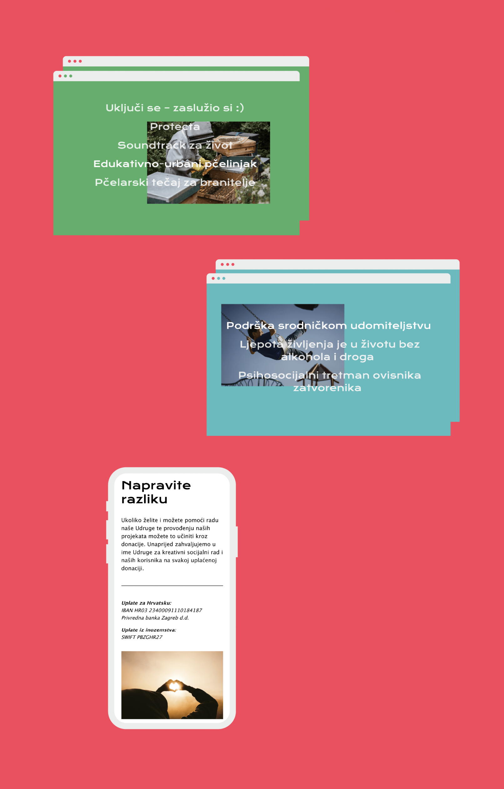 Projekt uključuje dizajn cijelog niza materijala – od poslovne dokumentacije, preko različitih prezentacijskih i promotivnih materijale, mrežnih stranica i online materijala do zasebnih pod-identiteta različitih programa Udruge.